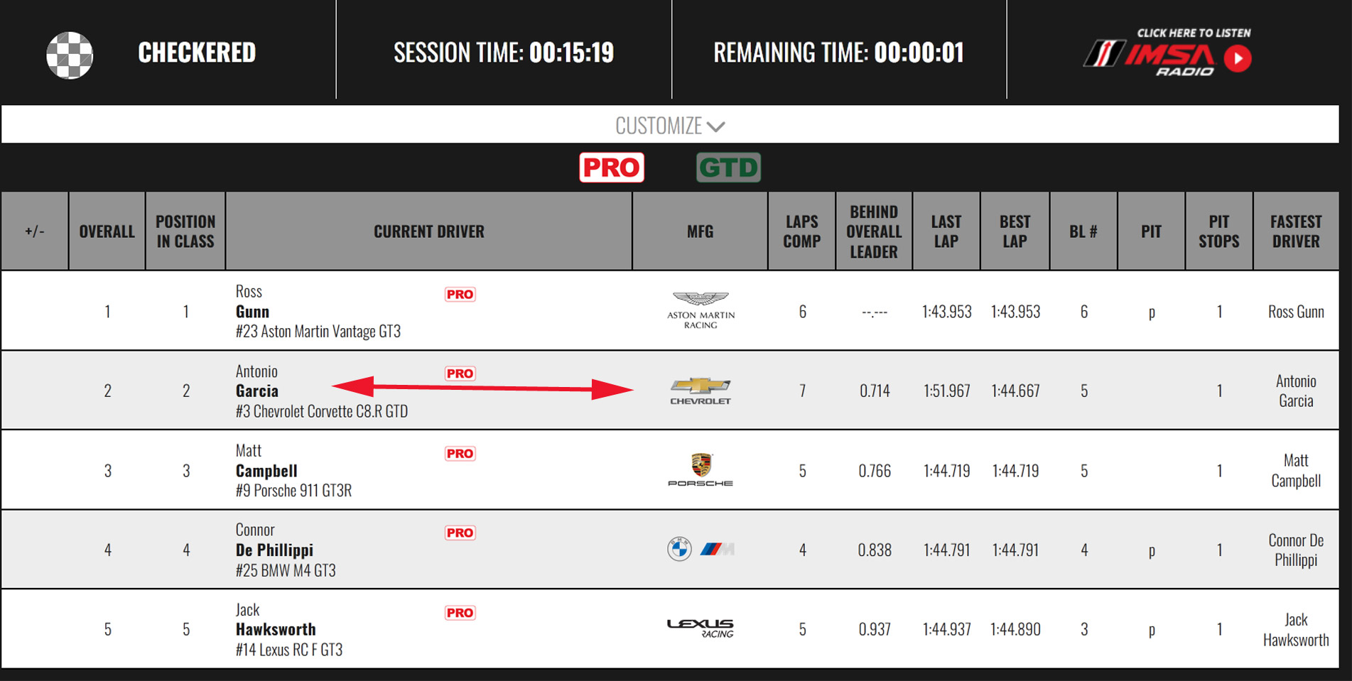 Garcia’s time of 1:44.677 (112.470 mph) in the No. 3 Mobil 1/SiriusXM Chevrolet Corvette C8.R put him only behind Ross Gunn’s pole-winning time, ahead of Sunday’s 2:10 p.m. ET race (CNBC, Peacock). Garcia will start the No. 3 Corvette and will share driving duties with Jordan Taylor.