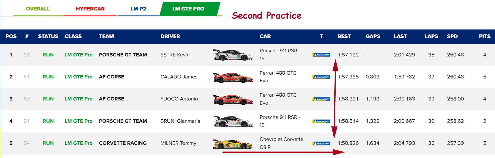The aforementioned title-leading No. 51 AF Corse Ferrari ended up third fastest, Pier Guidi a tenth off the best of the sister No. 52 Ferrari 488 GTE in the hands of Antonio Fuoco who set an early session best of 1m58.261s. Fourth was the No. 91 Porsche 911 RSR-19, ahead of the single Corvette C8.R which finished up fifth.