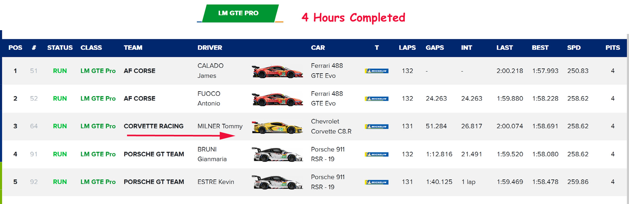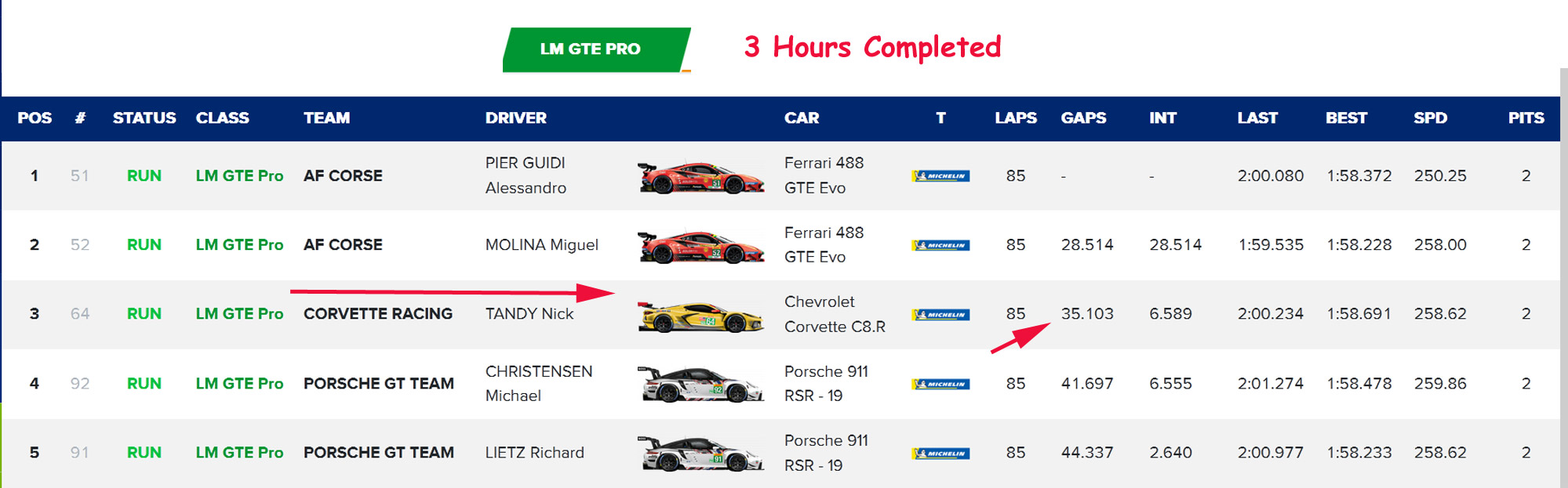 Pier Guidi has since taken over the leading Ferrari, with Tandy 3rd ahead of the No. 52 Ferrari piloted by Miguel Molina. Michael Christensen is fourth in the No. 92 Porsche with Richard Lietz fifth.