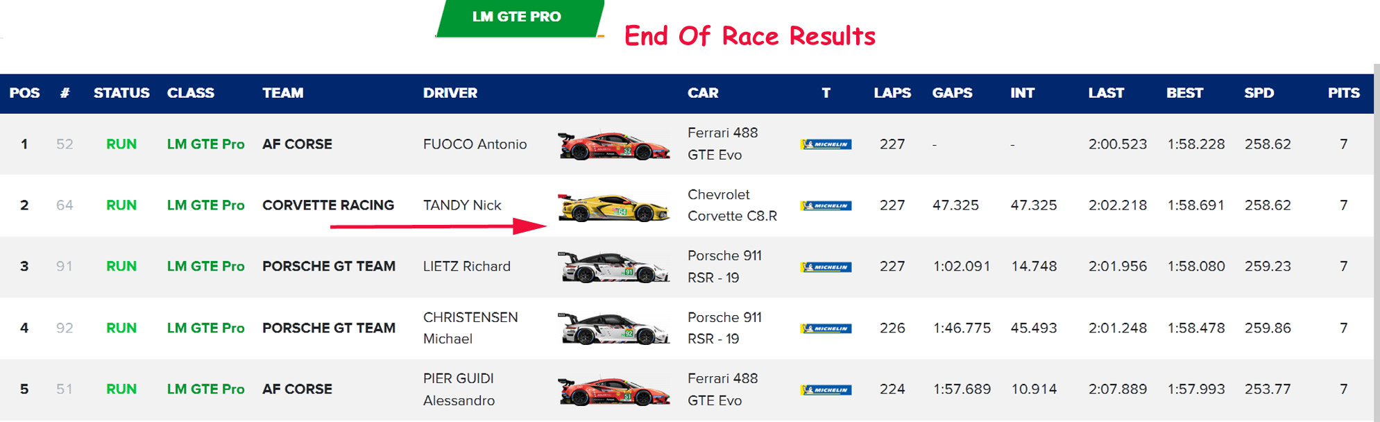 However, they nurtured the wounded car to fifth place in class behind the No. 92 duo of Estre and Christensen, which proved enough to win title with two points difference over the Porsche pairing.