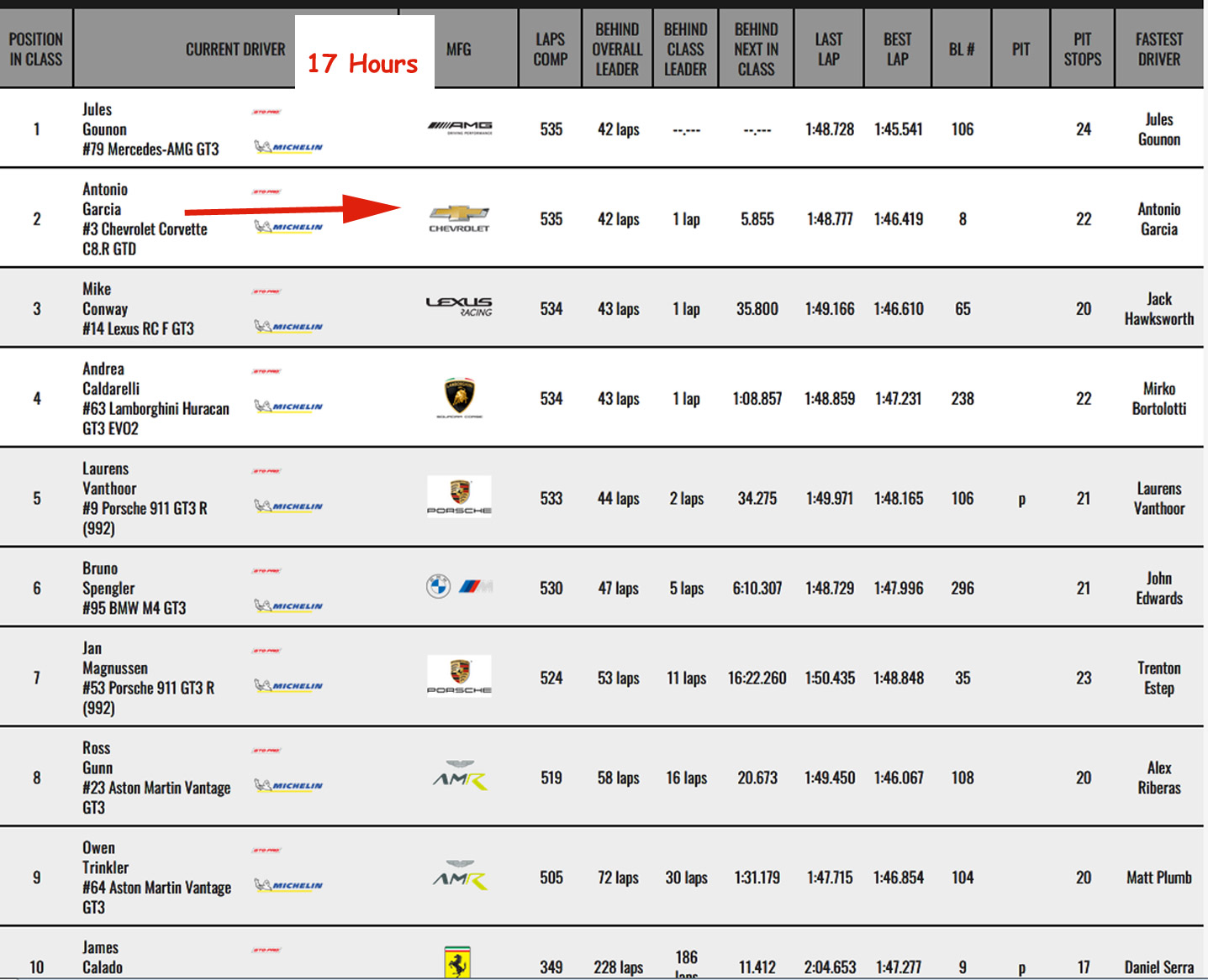 Milner gave way to Garcia for an even more chaotic final one hour, 45 minutes. The top three cars – the 3 Corvette, the 14 Lexus and 79 Mercedes – swapped back and forth through three full-course caution periods in the span of an hour and 20 minutes before a final 26-minute run to the flag with Garcia coming home second in class.
