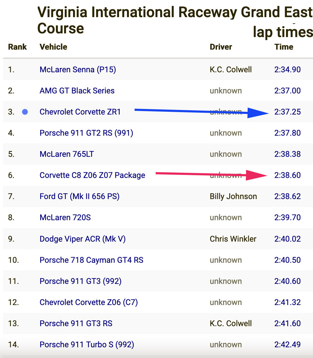 The last few Corvettes came with a bogey time from Chevrolet engineers, but aside from some development laps at VIR, the Z06 hadn't yet set a good time on the Grand Course. At other tracks, the Z06 ran comparable laps to the 755-hp C7 ZR1.