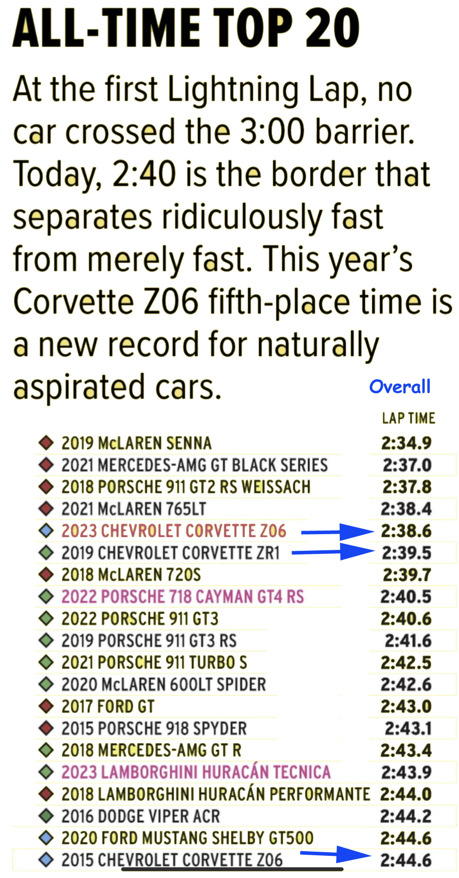 The Z06's 2:38.6 time is the fifth fastest in Lightning Lap history, and it's also the best lap time for a car with a naturally aspirated engine.