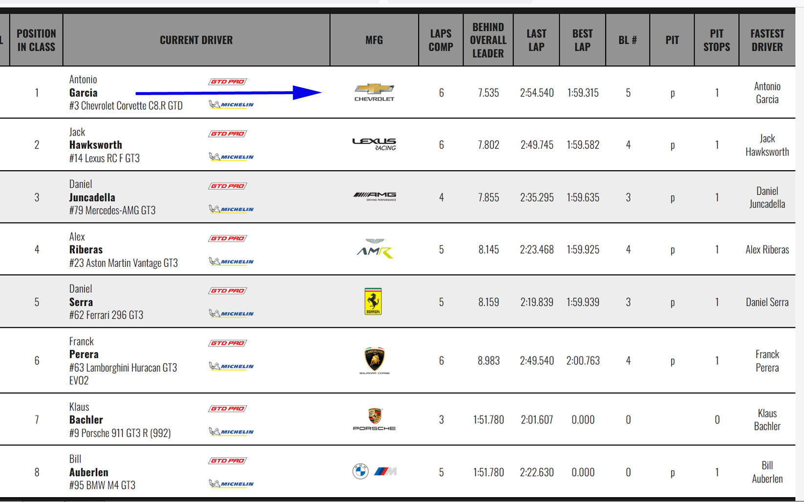 2023 WeatherTech SportsCar Championship – GTD PRO (After one of 11 events) Driver Standings 1. Cooper MacNeil/Daniel Juncadella/Jules Gounon/Maro Engel – 385 2. Antonio Garcia/Jordan Taylor/Tommy Milner – 348 3. Ben Barnicoat/Jack Hawksworth/Mike Conway – 330 4. Andrea Caldarelli/Jordan Pepper/Mirko Bortolotti/Romain Grosjean – 306 5. Klaus Bachler/Laurens Vanthoor/Patrick Pilet – 284