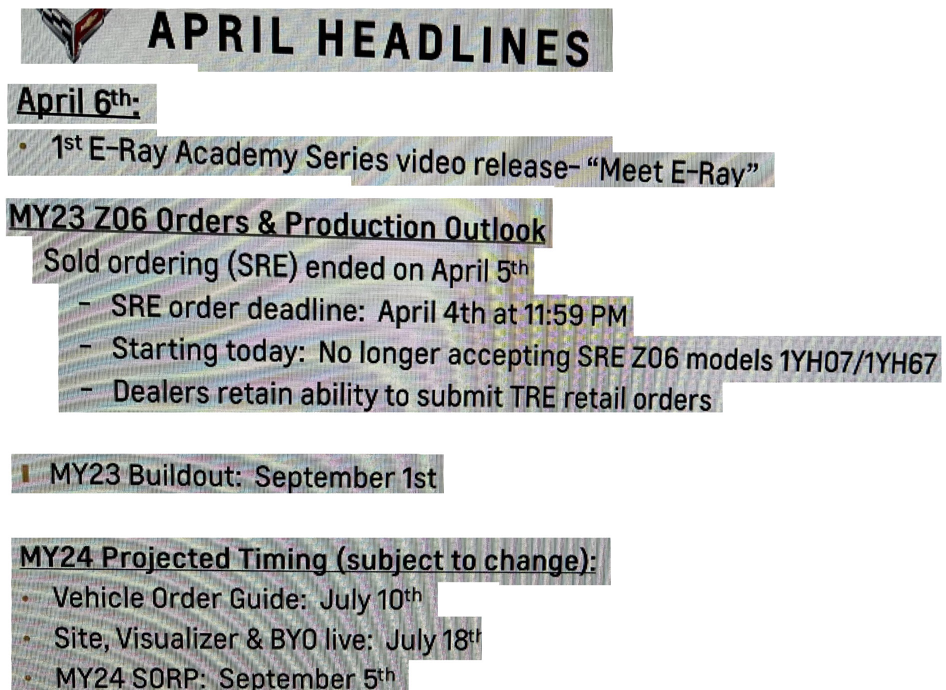 We still have many questions about why the model year is running until September 1st, yet, customer sold orders (SRE) for the Z06 were halted on April 5th. Dealers can still submit dealer stock orders (TRE) for any additional allocations that come in.
