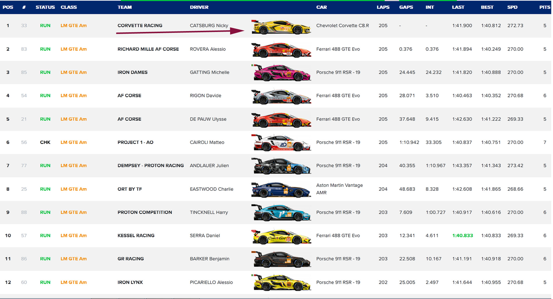 GTE Am came down to a duel in the final hour. Corvette Racing’s pole-sitting No. 33 C8.R and the No. 83 Richard Mille Racing Ferrari ended up in a battle for the lead in the final minutes, with Nicky Catsburg putting on a defensive masterclass to keep Alessio Rovera at bay.