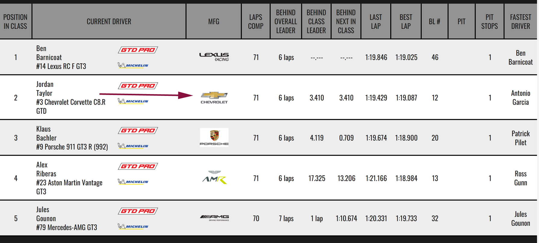 After some hard, side-to-side racing, Taylor stayed within one second of the No. 9 and made a strong, decisive move into Turn Six with a huge dive to the inside of the Porsche straight out of his recent experience in the NASCAR Cup Series with 40 minutes left to take the second-place spot. GTD lap traffic and faster GTP cars going by meant that Taylor had to spend the rest of the race with Bachler right on the rear bumper of the Corvette. Taylor stayed tough and held the position as the race ended during another full-course caution.