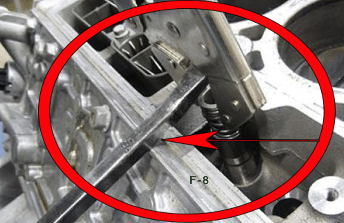If a lifter is stuck in the bore, use vice grips with a slide hammer or a small pry bar to remove the lifter. Do not pry on the sealing surface of the block when removing a lifter. (Fig. 8)