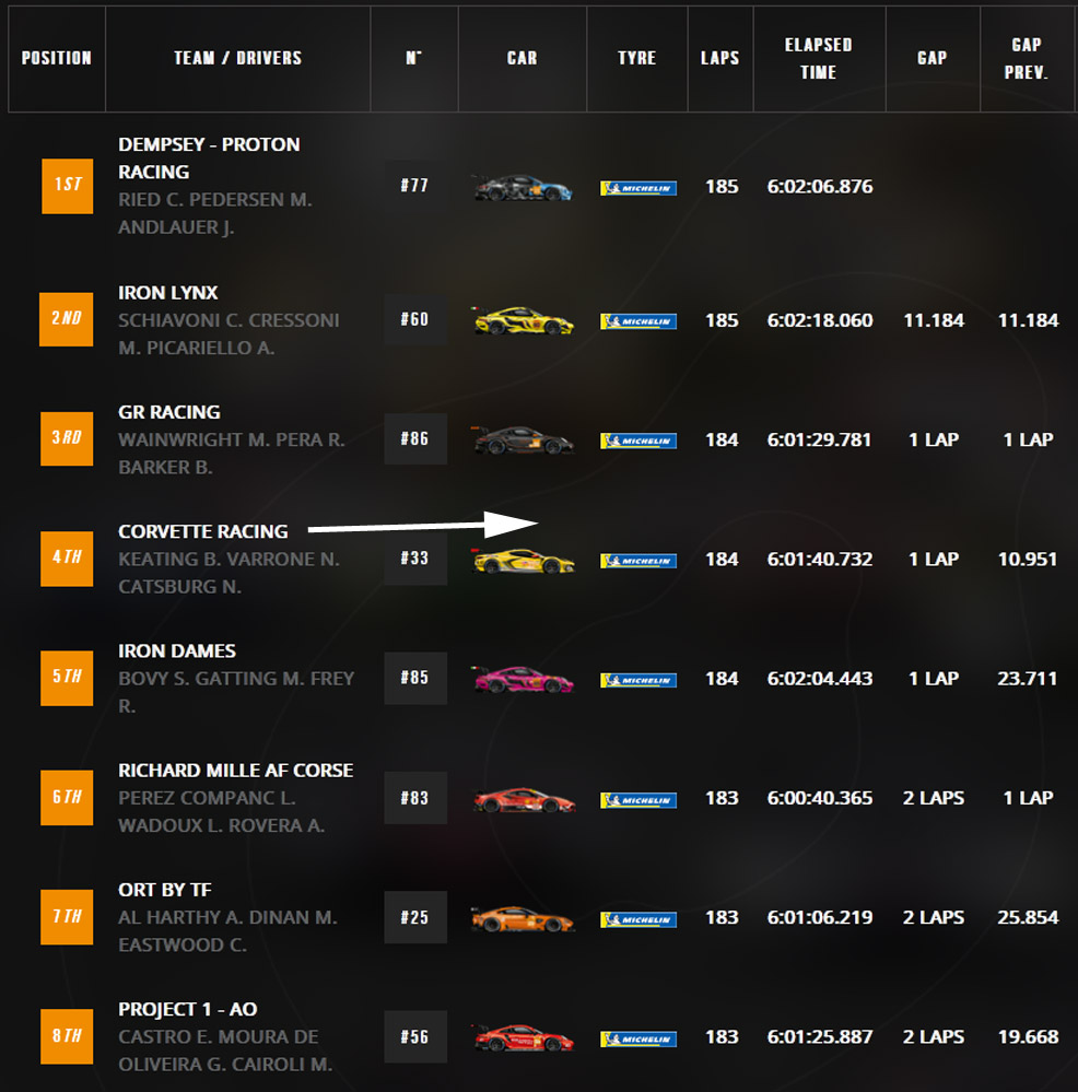 Corvette then dropped behind the No. 77 Dempsey-Proton Porsche of Christian Ried, Mikkel Pedersen and Julien Andlauer, which went on to win the race, and the No. 60 Iron Lynx entry when Catsburg took the car over in the penultimate hour.