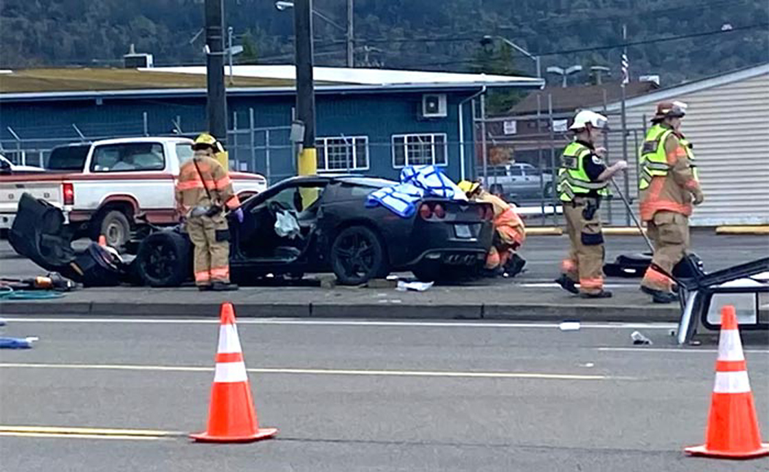 According to a witness, the Corvette was coming from Oakland Avenue between Clint Newell Auto Group and Safeway when it struck the southbound pickup. The Corvette ended up on the sidewalk next to a sign for Apex Ace Home Center. The pickup came to a rest upside down on the edge of the Apex property, facing westbound. The vehicle’s canopy came off and landed on Stephens Street.