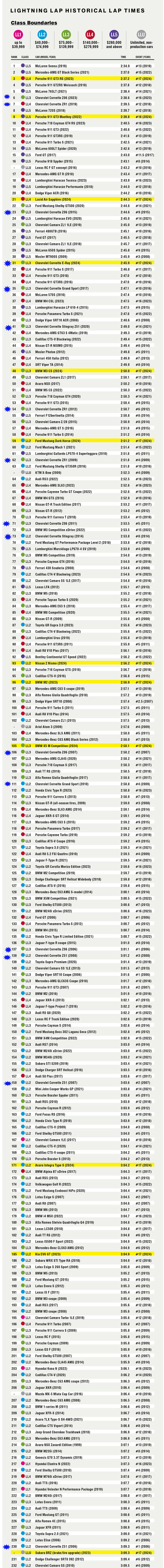 Lightning Lap testing, to see how cars perform, began in 2006 Here is how the gen 6, 7 and 8 places in the 1 lap at VIR Corvettes are shown in BOLD text Ranked Year Make Model - - - - Lap Time 1 2019 McLaren Senna, 2:34.9 2 2021 Mercedes-AMG GT Black Series, 2:37.0 3 2023 Porsche 911 GT3 RS, 2:37.2 4 2018 Porsche 911 GT2RS Weissach, 2:37.8 5 2021 McLaren 765LT, 2:38.4 6 2023 Chevy Corvette Z06, 2:38.6 7 2019 Chevy Corvette ZR1, 2:39.5 8 2018 McLaren 720S, 2:39.7 9 2022 Porsche 911 GT3 Manthey, 2:39.8 10 2023 Porsche 718 Cayman GT4 RS, 2:40.5 11 2022 Porsche 911 GT3, 2:40.6 12 2019 Porsche 911 GT3RS, 2:41.6 13 2021 Porsche 911 Turbo S, 2:42.5 14 2020 McLaren 600LT Spider, 2:42.6 15 2017 Ford GT, 2:43.0 16 2015 Porsche 918 Spyder, 2:43.1 17 2016 Lexus RC F GT concept, 2:43.2 18 2018 Mercedes-AMG GT R, 2:43.4 19 2023 Lamborghini Huracán Tecnica, 2:43.9 20 2018 Lamborghini Huracán Performante, 2:44.0 21 2016 Dodge Viper ACR, 2:44.2 22 2024 Lucid Air Sapphire, 2:44.3 23 2020 Ford Mustang Shelby GT500, 2:44.6 24 2015 Chevy Corvette Z06, 2:44.6 25 2020 Lamborghini Huracán EVO, 2:45.0 26 2019 Chevy Camaro ZL1 1LE , 2:45.0 27 2016 Ferrari 488GTB, 2:45.1 28 2017 Ford GT, 2:45.5 29 2018 Chevy Camaro ZL1 1LE, 2:45.7 30 2015 McLaren 650S Spider, 2:45.8 31 2009 Mosler MT900S, 2:45.9 32 2024 Chevy Corvette E-Ray, 2:45.9 33 2017 Porsche 911 Turbo S, 2:46.8 34 2018 Porsche 911 GT3, 2:47.0 35 2016 Porsche 911 GT3RS, 2:47.0 36 2017 Chevy Corvette Grand Sport, 2:47.1 37 2016 McLaren 570S, 2:47.4 38 2023 BMW M4 CSL, 2:47.5 39 2015 Lamborghini Huracán LP 610-4, 2:47.5 40 2021 Porsche Panamera Turbo S, 2:47.8 41 2008 Dodge Viper SRT10 ACR, 2:48.6 42 2020 Chevy Corvette Stingray Z51, 2:49.0 43 2019 Mercedes-AMG GT63 S 4Matic, 2:49.3 44 2022 Cadillac CT5-V Blackwing, 2:49.4 45 2015 Nissan GT-R NISMO, 2:49.4 46 2012 Mosler Photon, 2:49.8 47 2012 Ferrari 458 Italia, 2:49.9 48 2014 SRT Viper TA, 2:49.9 49 2024 BMW M3 CS, 2:50.0 50 2017 Chevy Camaro ZL1, 2:50.1 51 2017 Acura NSX, 2:50.2 52 2022 BMW M5 CS, 2:50.3 53 2020 Porsche 718 Cayman GT4, 2:50.3 54 2015 Porsche 911 GT3, 2:50.4 55 2012 Chevy Corvette ZR1, 2:50.7 56 2014 Ferrari F12berlinetta, 2:50.8 57 2015 Chevy Camaro Z/28, 2:50.9 58 2016 Mercedes-AMG GT S, 2:51.0 59 2014 Porsche 911 Turbo S, 2:51.2 60 2024 Ford Mustang Dark Horse, 2:51.2 61 2021 Ford Mustang Mach 1, 2:51.4 62 2010 Lamborghini Gallardo LP570-4 Superleggara, 2:51.8 63 2009 Chevy Corvette ZR1, 2:51.8 64 2016 Ford Mustang Shelby GT350R, 2:51.8 65 2009 KTM X-Bow, 2:52.3 66 2022 Audi RS3, 2:52.5 67 2022 Mercedes-AMG SL63, 2:52.6 68 2022 Porsche Cayenne Turbo GT Coupe, 2:52.6 69 2016 BMW M4 GTS, 2:52.9 70 2017 Nissan GT-R Track Edition, 2:53.2 71 2012 Nissan GT-R, 2:53.2 72 2018 Porsche 911 Carrera T, 2:53.4 73 2011 Chevy Corvette Z06, 2:53.5 74 2022 BMW M3 Competition xDrive, 2:53.5 75 2014 Chevy Corvette Stingray, 2:53.8 76 2018 Ford Mustang GT Performance Package Level 2, 2:53.8 77 2010 Lamborghini Murciélago LP670-4 SV, 2:53.9 78 2019 BMW M5 Competition, 2:54.0 79 2016 Porsche Cayman GT4, 2:54.0 80 2008 Ferrari 430 Scuderia, 2:54.6 81 2023 Cadillac CT4-V Blackwing, 2:54.6 82 2017 Chevy Camaro SS 1LE, 2:54.8 83 2012 Lexus LFA, 2:55.1 84 2018 BMW M5, 2:55.2 85 2020 Porsche Taycan Turbo S, 2:55.2 86 2018 Mercedes-AMG E63 S, 2:55.4 87 2020 BMW M8 Competition, 2:55.5 88 2009 Nissan GT-R, 2:55.6 89 2023 Toyota GR Supra 3.0, 2:55.6 90 2022 Cadillac CT4-V Blackwing, 2:55.6 91 2019 Lamborghini Urus, 2:55.8 92 2011 Porsche 911 GT3RS, 2:55.9 93 2017 Audi R8 V10 Plus, 2:56.1 94 2022 Bentley Continental GT Speed, 2:56.2 95 2024 Nissan Z Nismo, 2:56.2 96 2018 Porsche 718 Cayman GTS, 2:56.7 97 2016 Cadillac CTS-V, 2:56.8 98 2023 BMW M2, 2:56.9 99 2019 Mercedes-AMG C63 S coupe, 2:57.1 100 2018 Alfa Romeo Giulia Quadrifoglio, 2:57.2 101 2008 Dodge Viper SRT10, 2:57.4 102 2011 Porsche 911 Turbo S, 2:57.5 103 2014 Audi R8 V10 Plus, 2:57.5 104 2013 Chevy Camaro ZL1, 2:57.5 105 2009 Ariel Atom 3, 2:57.6 106 2011 Mercedes-Benz SLS AMG, 2:58.0 107 2012 Mercedes-Benz C63 AMG Black Series, 2:58.0 108 2024 BMW X5 M Competition, 2:58.1 109 2007 Chevy Corvette Z06, 2:58.2 110 2020 Mercedes-AMG CLA45, 2:58.2 111 2017 Porsche 718 Cayman S, 2:58.3 112 2018 Audi TT RS, 2:58.5 113 2017 Alfa Romeo Giulia Quadrifoglio, 2:58.6 114 2010 Chevy Corvette Grand Sport, 2:58.8 115 2023 Honda Civic Type R, 2:58.8 116 2013 Porsche 911 Carrera S, 2:58.9 117 2009 Nissan GT-R (all-season tires), 2:59.0 118 2014 Mercedes-Benz SL63 AMG, 2:59.1 119 2014 Jaguar XKR-S GT, 2:59.1 120 2015 Mercedes-AMG C63 S, 2:59.2 121 2017 Porsche Panamera Turbo, 2:59.2 122 2019 Porsche Cayenne Turbo, 2:59.2 123 2016 Cadillac ATS-V Coupe, 2:59.2 124 2021 Toyota Supra 3.0 Premium, 2:59.3 125 2010 Audi R8 5.2 FSI Quattro, 2:59.5 126 2021 Jaguar F-Type R, 2:59.5 127 2023 Toyota GR Corolla Morizo Edition, 2:59.6 128 2019 BMW M2 Competition, 2:59.7 129 2018 Dodge Challenger SRT Hellcat Widebody, 2:59.8 130 2016 Cadillac ATS-V, 2:59.8 131 2014 Mercedes-Benz E63 AMG S-model, 3:00.1 132 2021 BMW X5M Competition, 3:00.5 133 2013 Ford Shelby GT500, 3:00.6 134 2022 BMW M240i xDrive, 3:00.6 135 2006 Ford GT, 3:00.7 136 2012 Porsche Panamera Turbo S, 3:00.7 137 2015 BMW M4, 3:00.7 138 2021 Honda Civic Type R Limited Edition, 3:00.7 139 2015 Jaguar F-type R coupe, 3:01.0 140 2006 Chevy Corvette Z06, 3:01.1 141 2008 Chevy Corvette Z51, 3:01.2 142 2020 Toyota Supra Premium, 3:01.4 143 2013 Chevy Camaro SS 1LE, 3:01.5 144 2006 Dodge Viper SRT10 Coupe, 3:01.6 145 2018 Mercedes-AMG GLC63S Coupe, 3:01.7 146 2007 Porsche 911 GT3, 3:01.8 147 2016 BMW M2, 3:01.9 148 2013 Jaguar XKR-S, 3:02.1 149 2016 Jaguar F-type Project 7, 3:02.2 150 2020 Audi RS Q8, 3:02.2 151 2020 Lexus RC F Track Edition, 3:02.6 152 2014 Porsche Cayman S, 3:02.6 153 2012 Ford Mustang Boss 302 Laguna Seca, 3:02.8 154 2022 BMW X4M Competition, 3:02.9 155 2014 Audi RS7, 3:03.0 156 2022 BMW M240i xDrive, 3:03.0 157 2020 BMW M340i, 3:03.2 158 2019 Subaru STI S209, 3:03.4 159 2016 Dodge Charger SRT Hellcat, 3:03.5 1