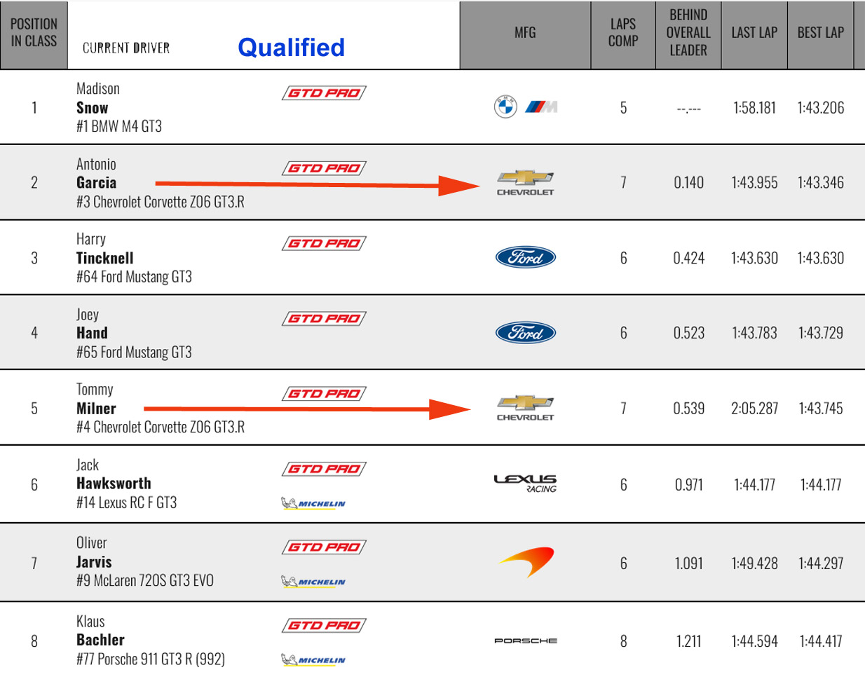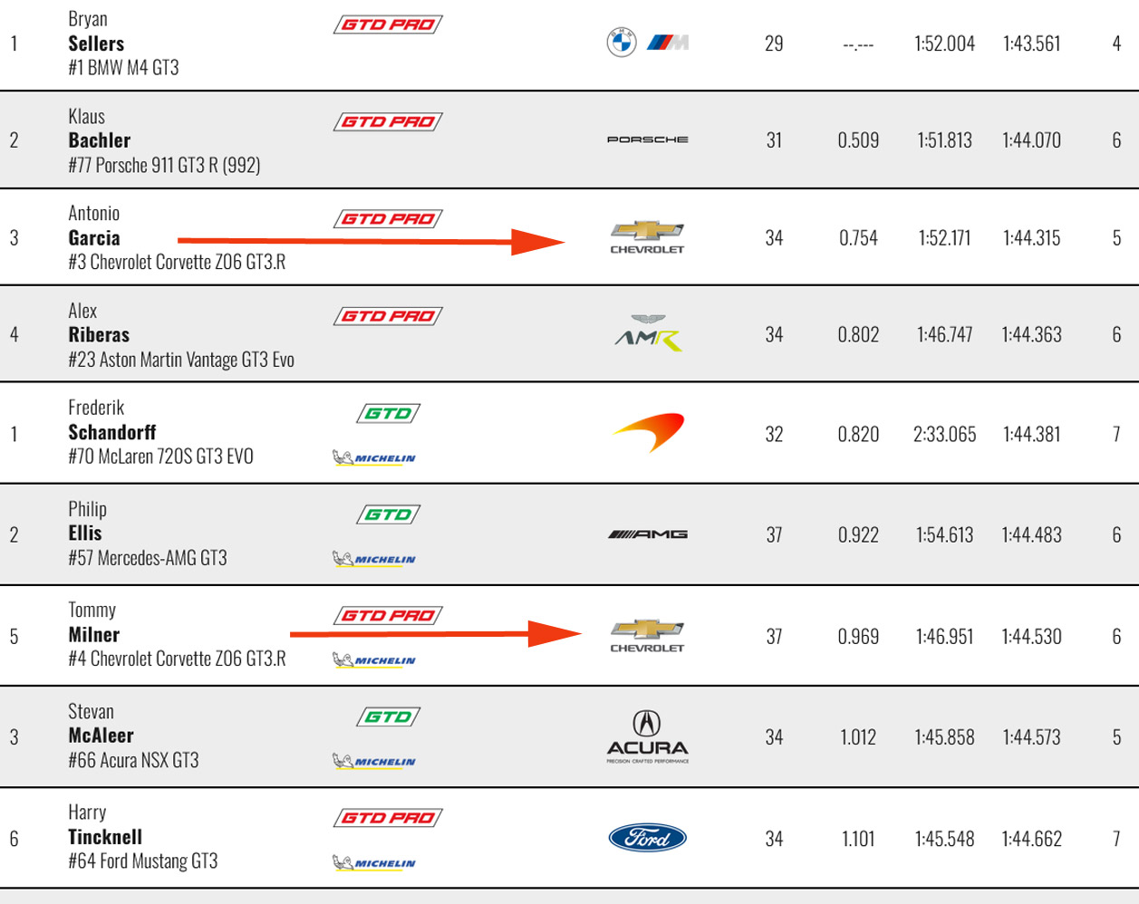Alexander Sims posted the third-quickest time overall and in class in his No. 3 Corvette Racing by Pratt Miller Motorsports Chevrolet Corvette Z06 GT3.R, followed by Alex Riberas in the No. 23 Heart of Racing Team Aston Martin Vantage GT3 Evo.