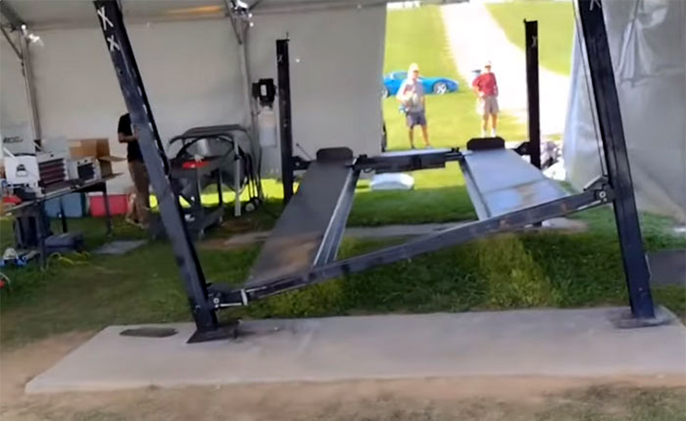 Apparently, at one of the vendors claiming performance mods for C8s installer tents, a four-post lift had a cable failure, and it buckled with a Rapid Blue C8 Corvette stuck on it.