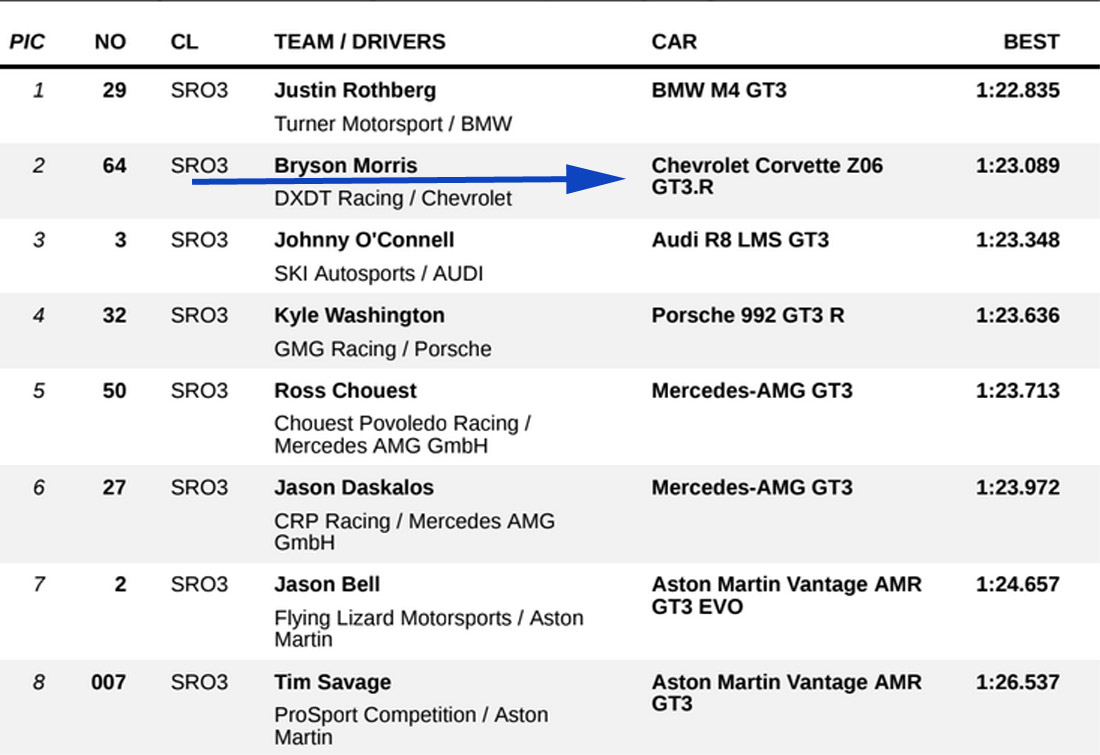 Johnny O’Connell qualified third with a 1:23.348 lap time from his No. 3 SKI Autosports Audi R8 LMS GT3 Evo II. The No. 32 GMG Racing Porsche 911 GT3 R of Kyle Washington was fourth, with Ross Chouest completing the top-five in his No. 50 Chouest-Povoledo Racing Mercedes-AMG GT3 Evo.