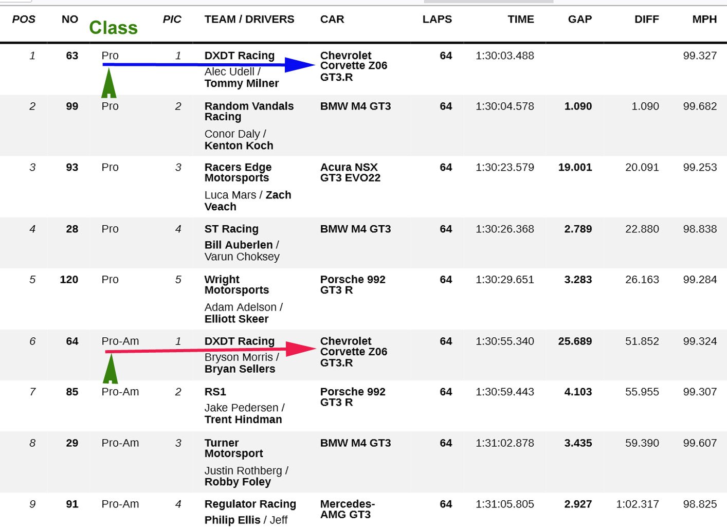 Meanwhile, Morris advanced from third to second in his opening stint, with Sellers chasing down and eventually passing for the class lead and win with a little less than four minutes remaining. It marked the second victory in three races for the new pairing.