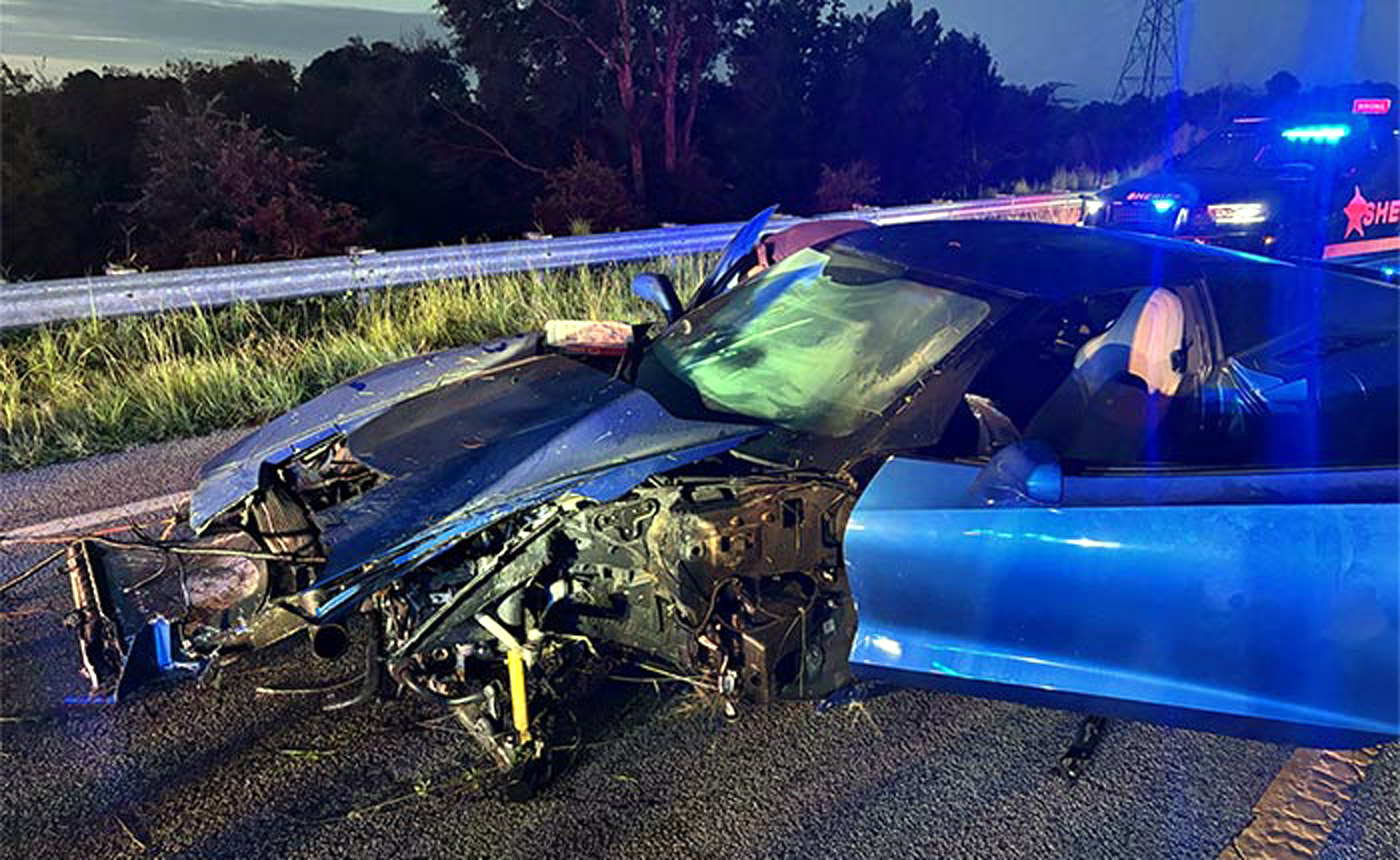 The pursuit finally came to an end when the Corvette crashed into a guardrail. The suspect then climbed out of the heavily damaged Stingray and ran into a nearby swamp and then into a pond.