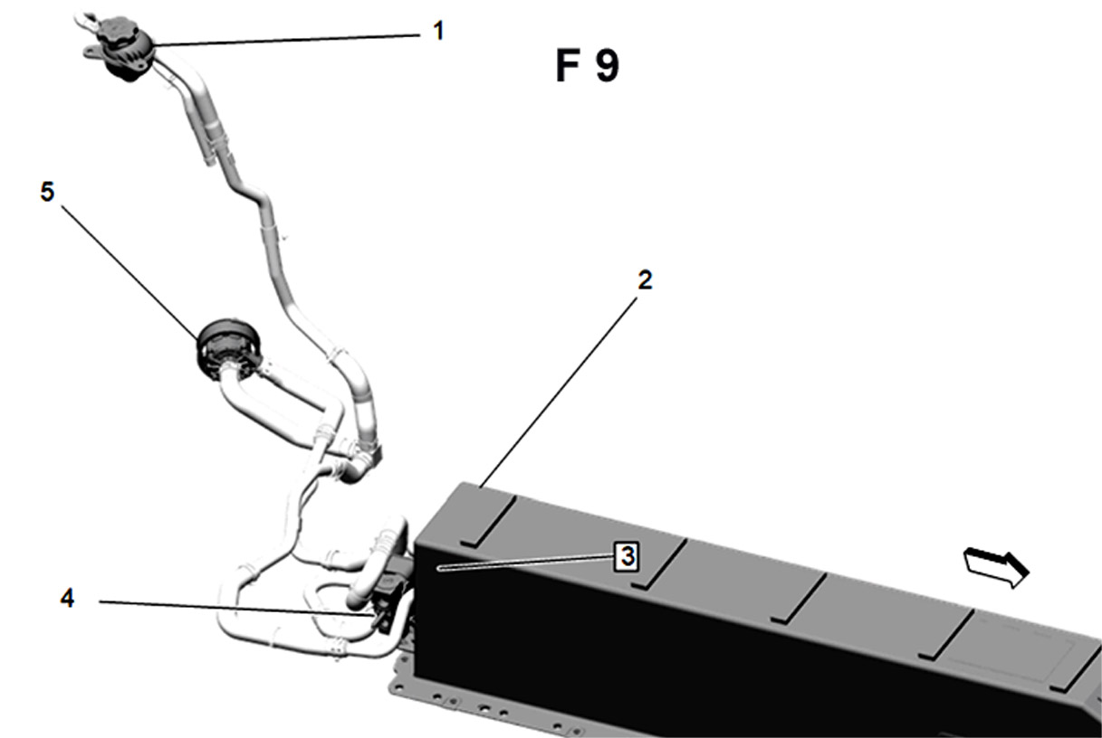 The 2024-2025 Corvette E-Ray features an independent cooling system to cool the high-voltage battery. If air gathers and gets trapped in the hoses around the Hybrid/Electric Vehicle Battery Coolant Pump (Fig. 9, #5) during repairs, it can cause the pump to stop for self-protection, which the Battery Energy Control Module (BECM) interprets as an under-speed condition. DTC P0E3C (Hybrid/Electric Vehicle Battery Pack Coolant Pump Underspeed) may set in the BECM and DTC P0A7B (Battery Energy Control Module Requested Malfunction Indicator Lamp Illumination) may set in the Engine Control Module (ECM). The air trapped in the system must be purged.