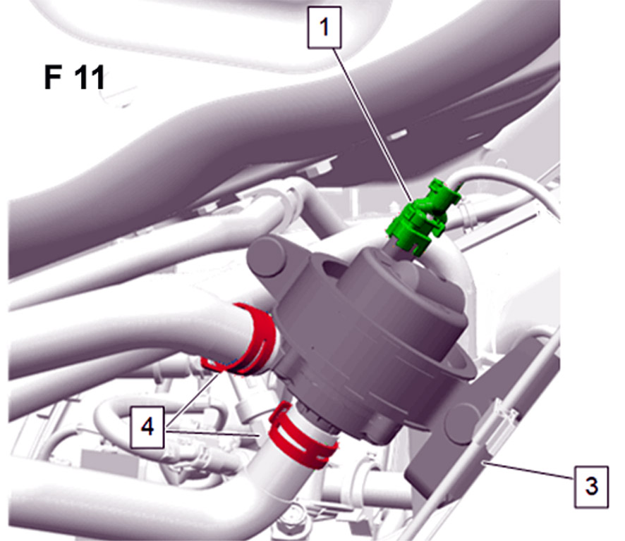 Use GDS 2 to run the Hybrid/Electric Vehicle Battery Coolant Pump (Fig. 11) at 4,000 RPM for 15 minutes. If the coolant level drops, fill the cooling system using DexCool 50/50 Premix. The coolant level should just cover the white indicator at the bottom of the small coolant reservoir. For reference, the total system volume is 1.9 L. Run the pump again if needed to purge all air from the system.
