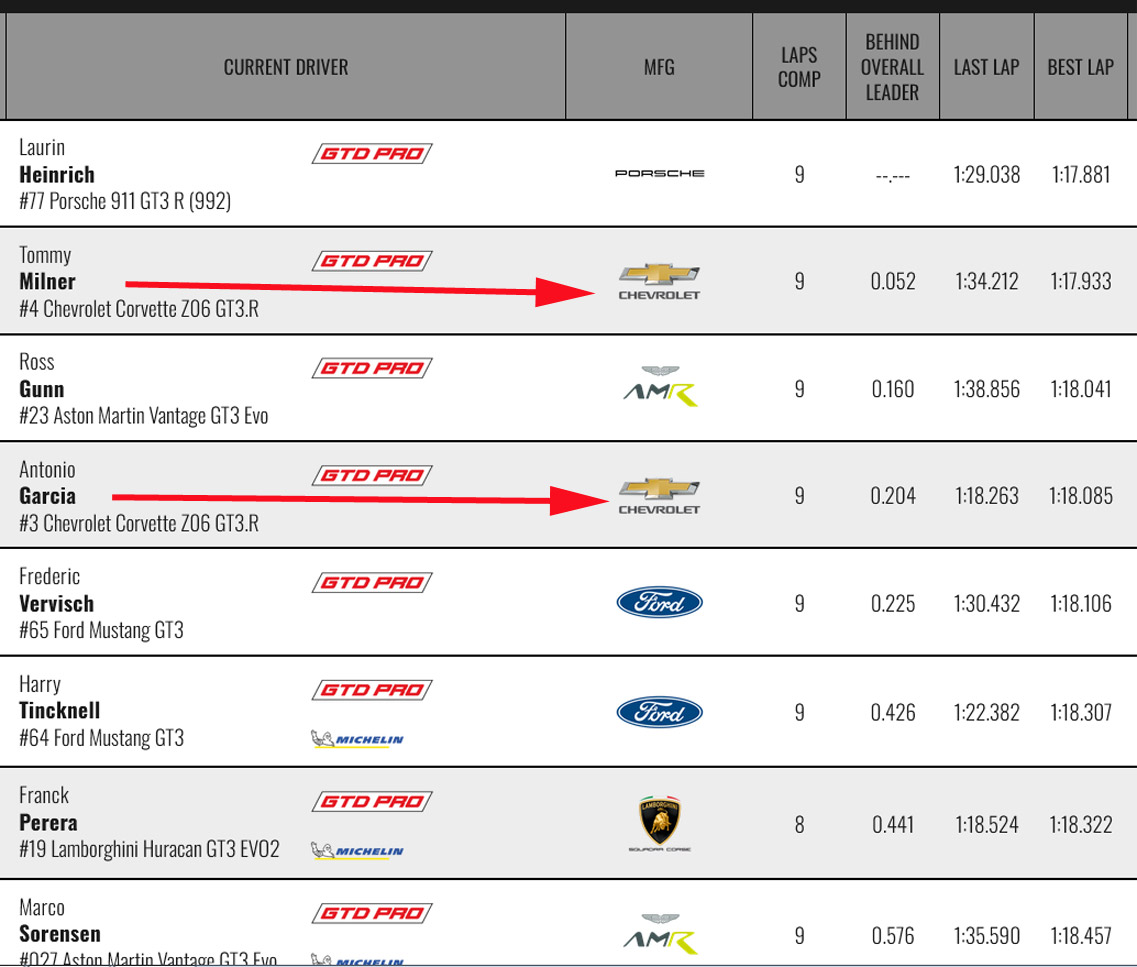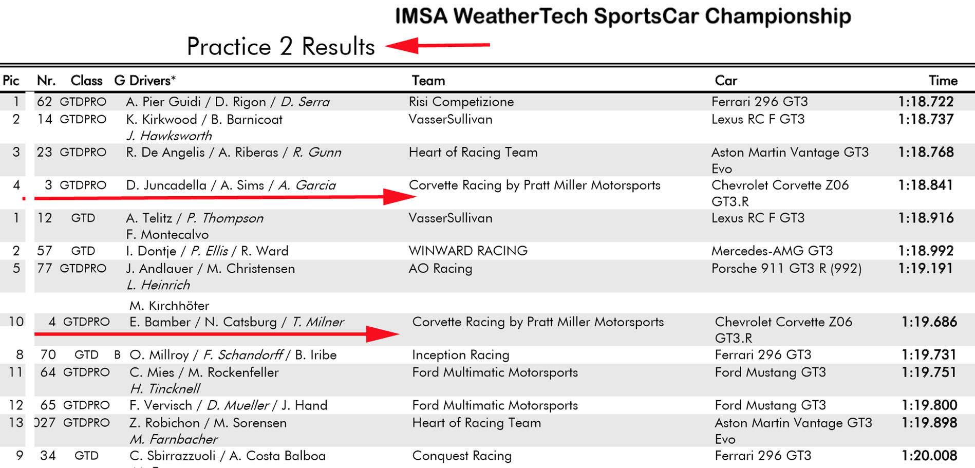 • Antonio Garcia, Alexander Sims and Daniel Juncadella in the No. 3 Corvette • Tommy Milner, Nicky Catsburg and Earl Bamber in the No. 4 Z06 GT3.R • Orey Fidani, Matt Bell and Lars Kern in the AWA Corvette