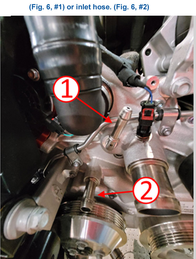 An engine coolant leak may be noticed on the ground or on the front of the engine after the vehicle has been parked for a while on 2023-2024 Corvette Z06 models equipped with the 5.5L V8 engine (RPO LT6). The coolant leak is most often found around the water pump area at the bleed tube (Fig. 6, #1) or inlet hose. (Fig. 6, #2)