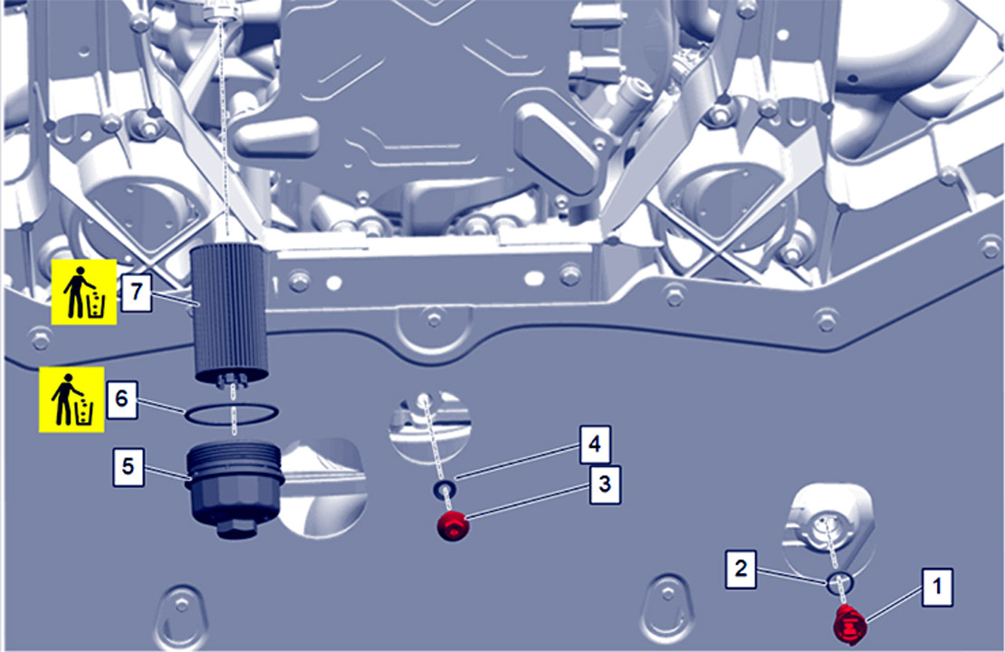 The 5.5L engine (RPO LT6) oil change procedure is different from the 6.2L engine (RPO LT2), which has just one drain plug. The 5.5L engine has two oil drain plugs that must be removed during the oil change procedure. There is a drain plug for the lower oil pan (Fig. 12, #3) and a drain plug at the oil tank location. (Fig. 12, #1) Allow the oil to drain completely from both drain plug locations.