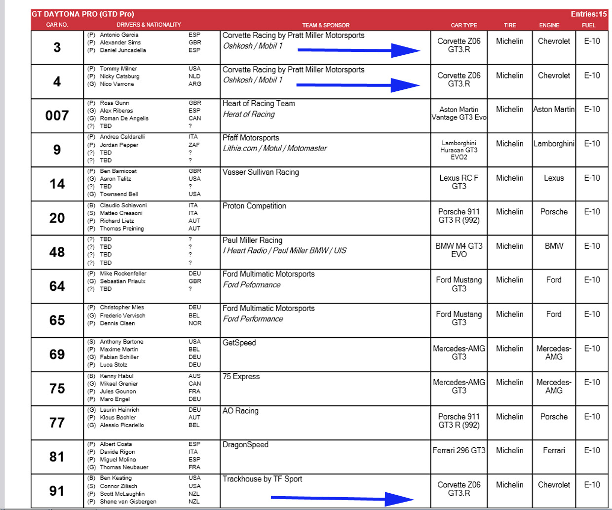 • Trackhouse by TF Sport – GTD PRO: Ben Keating, Scott McLaughlin, Shane van Gisbergen, Connor Zilisch (No. 91 Corvette)