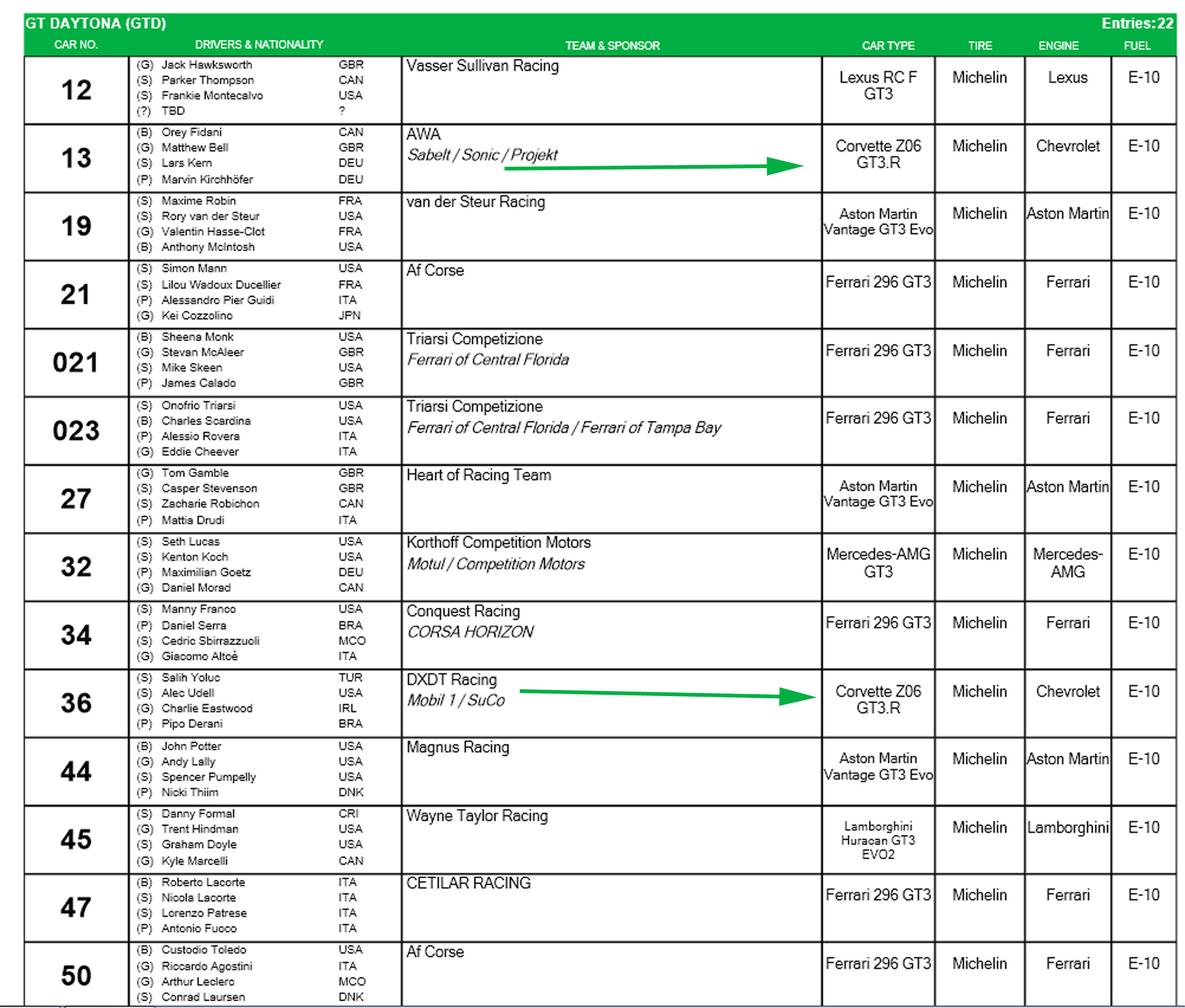 • Corvette Racing by Pratt Miller Motorsports – GTD PRO: Antonio Garcia, Alexander Sims, Daniel Juncadella(No. 3 Corvette); Nicky Catsburg, Tommy Milner, Nico Varrone (No. 4 Corvette) • AWA – GTD: Matt Bell, Orey Fidani, Lars Kern, Martin Kirchhoeffer (No. 13 Corvette) • DXDT Racing – GTD: Charlie Eastwood, Alec Udell, Salih Yoluc, Pipo Derani (No. 36 Corvette) • Trackhouse by TF Sport – GTD PRO: Ben Keating, Scott McLaughlin, Shane van Gisbergen, Connor Zilisch (No. 91 Corvette)