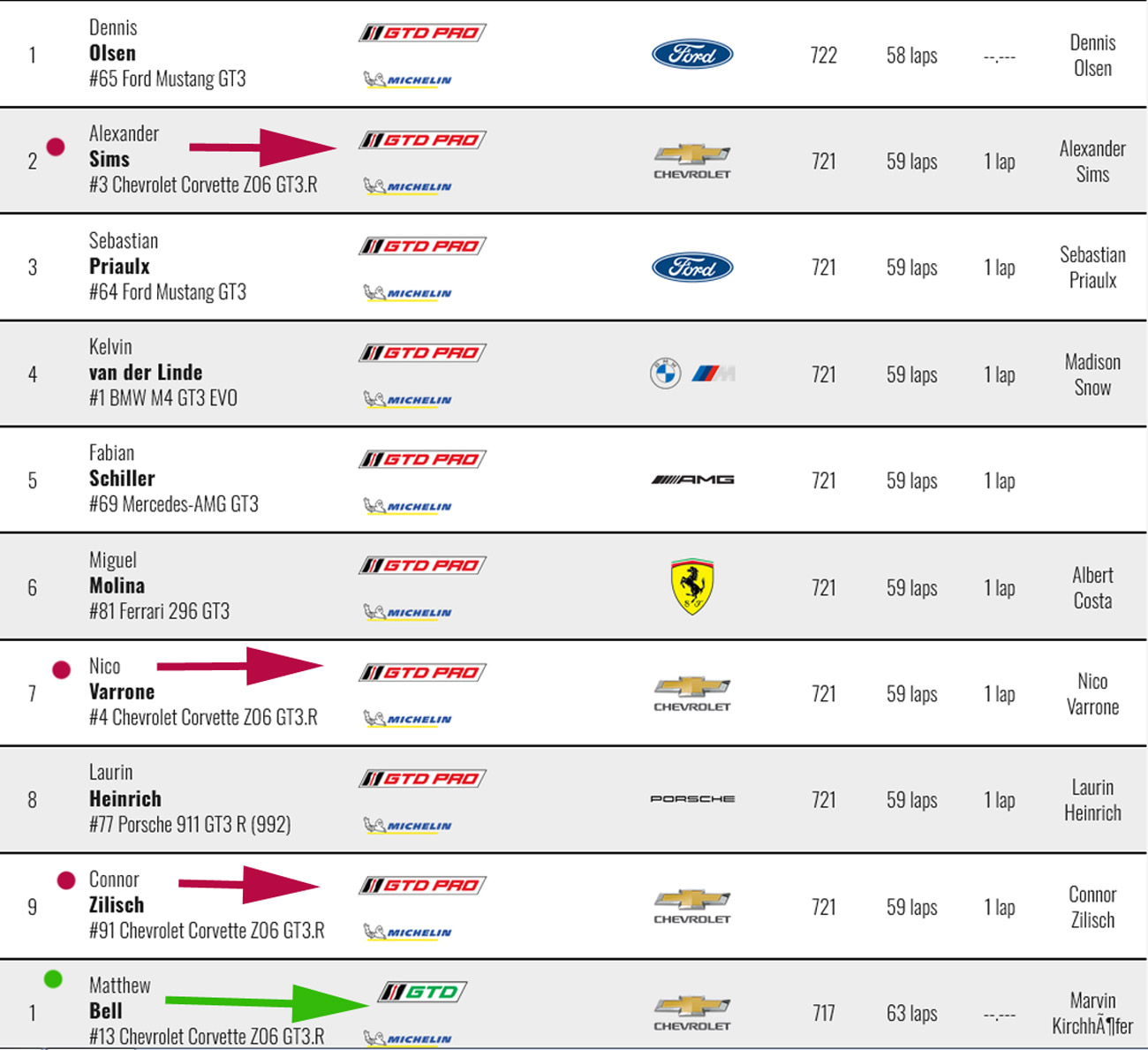 As Olsen and Sims ran tail-to-nose in GTD PRO, Bell came back at Drudi, and retook the GTD lead for AWA with 16 minutes to go. With 12 minutes left, another BMW vs. Corvette flashpoint happened as Van der Linde and Sims banged fenders out of the infield and onto the banking.