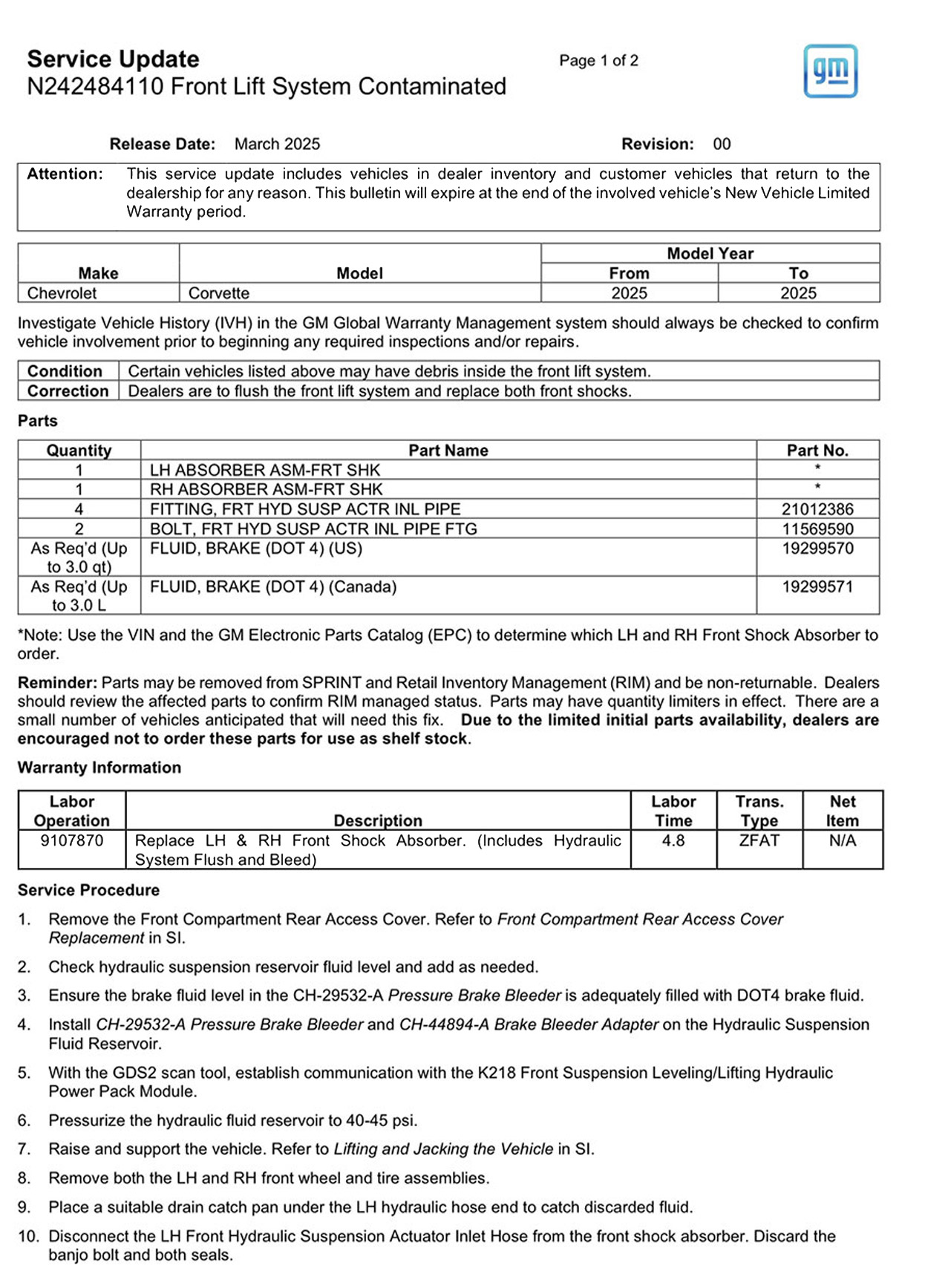 Chevy has just issued a new Technical Service Bulletin (#N242484110) for 2025 Corvettes over contamination in the Front Lift system. If your 2025 Corvette is experiencing front lift issues, it could be time for a visit to your local Chevrolet dealer’s service department.