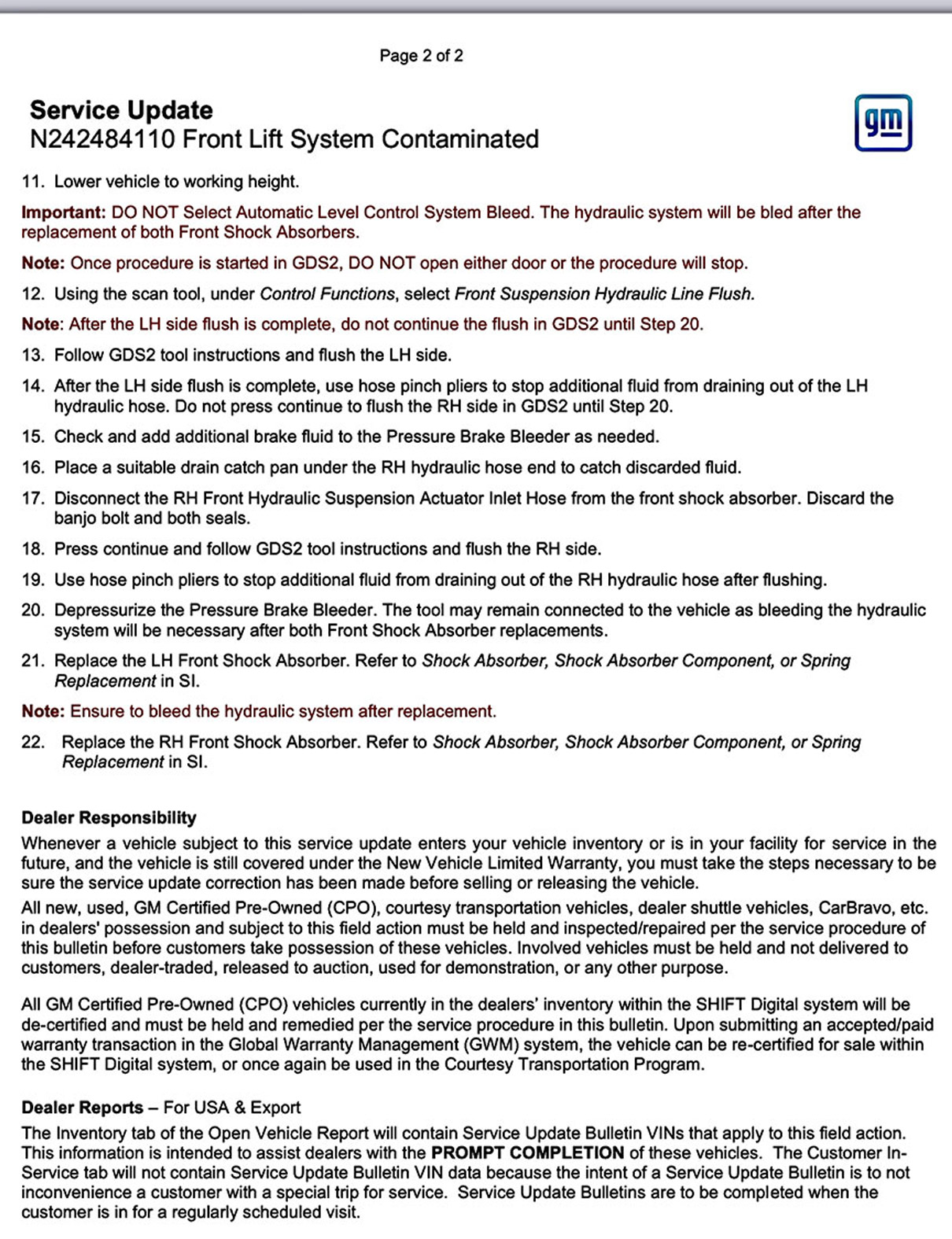 GM says certain vehicles from 2025 may have debris inside the front lift system, and the corrective action by technicians is to flush the system and replace the two front shock absorbers.