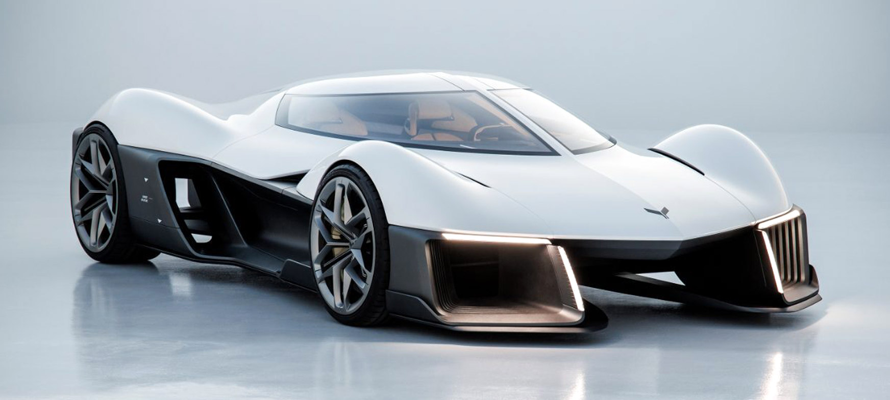 This design includes a two distinctive auto body design. The upper half capturing classic Corvette design elements. The lower half focused on the future of technology, including EV battery technology embedded into the structure and aerodynamic elements that are designed to channel air efficiently without the need for wings or spoilers.