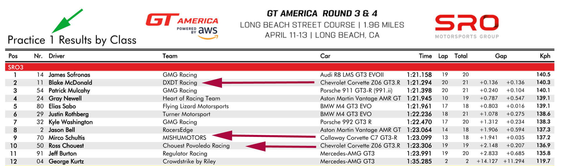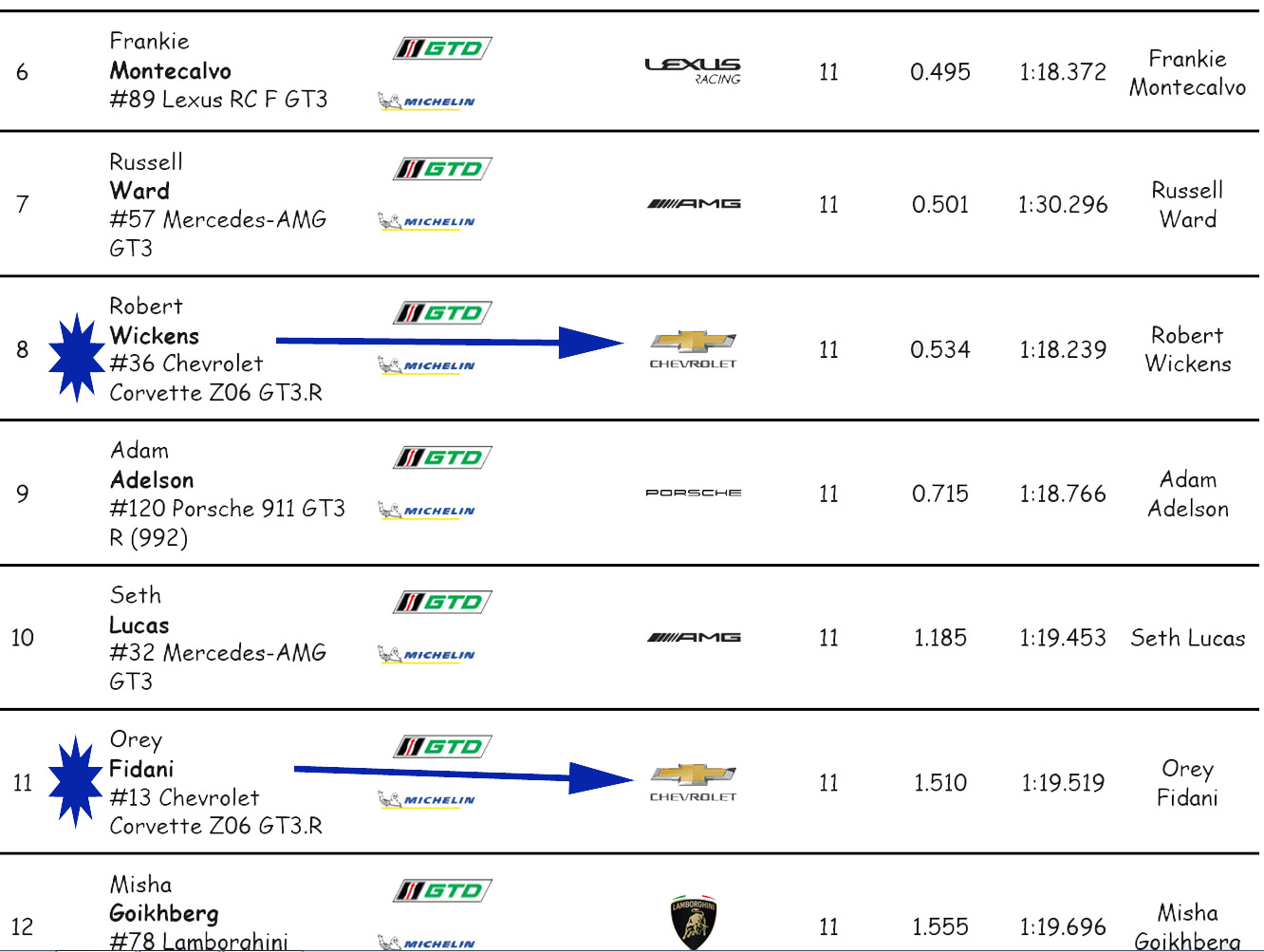 No. 11 DXDT Racing Chevrolet Corvette Z06 GT3.R – Blake McDonald No. 50 Chouest Povoledo Racing Chevrolet Corvette Z06 GT3.R – Ross Chouest No. 70 MISHUMOTORS Callaway Corvette C7 GT3-R – Mirco Schultis