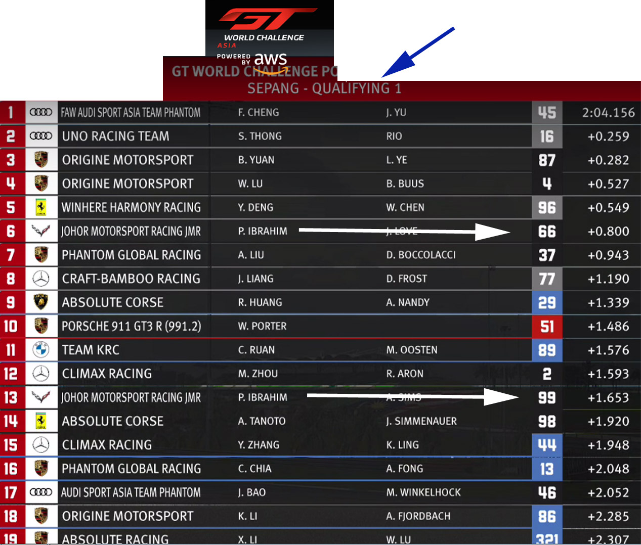 Lu was handed a drive-through penalty for causing Zhou to spin, allowing Jefri Ibrahim into a lead he would maintain to the checkered flag delivering Corvette its first victory on Asian soil on JMR’s first weekend with the new car.