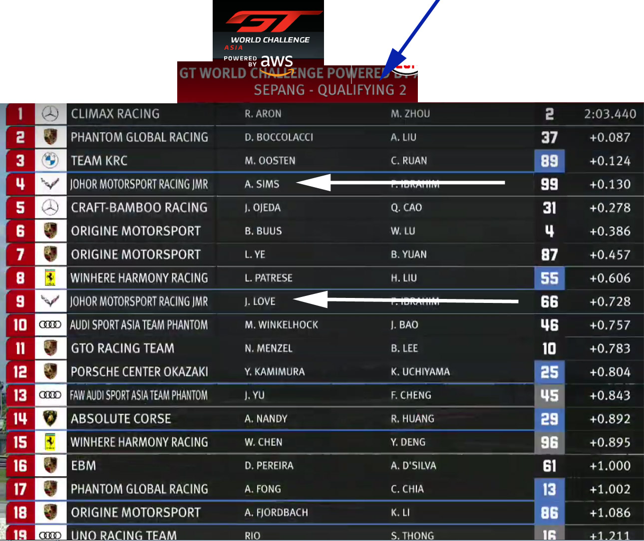 Sims and Jefri Ibrahim had looked on course to finish third in Sunday’s race until seven minutes to go, when Lu Wei, driving the No. 4 Origine Porsche, made contact at Turn 2 with the leading No. 2 Climax Racing Mercedes-AMG GT3 Evo of Zhou Bihuang.
