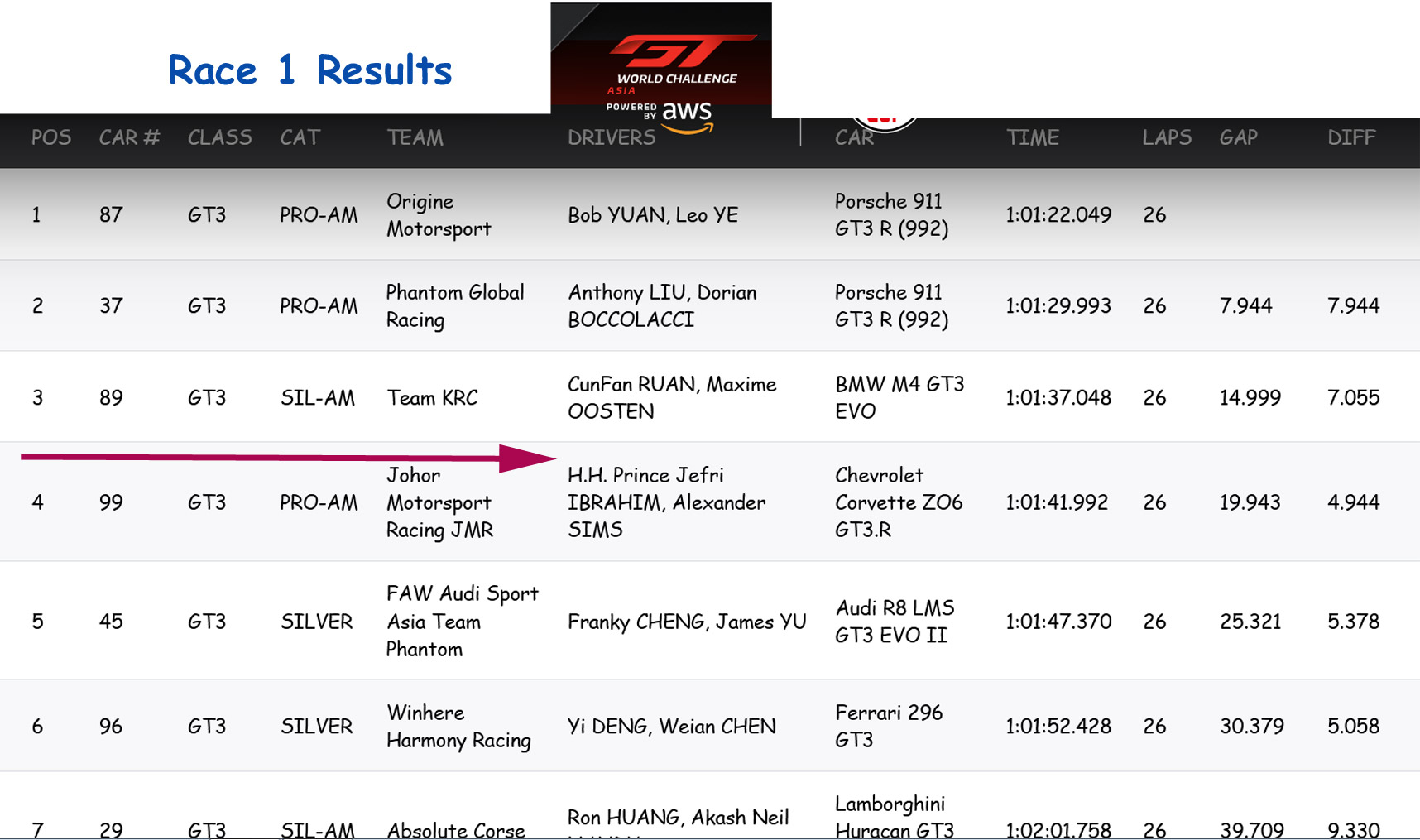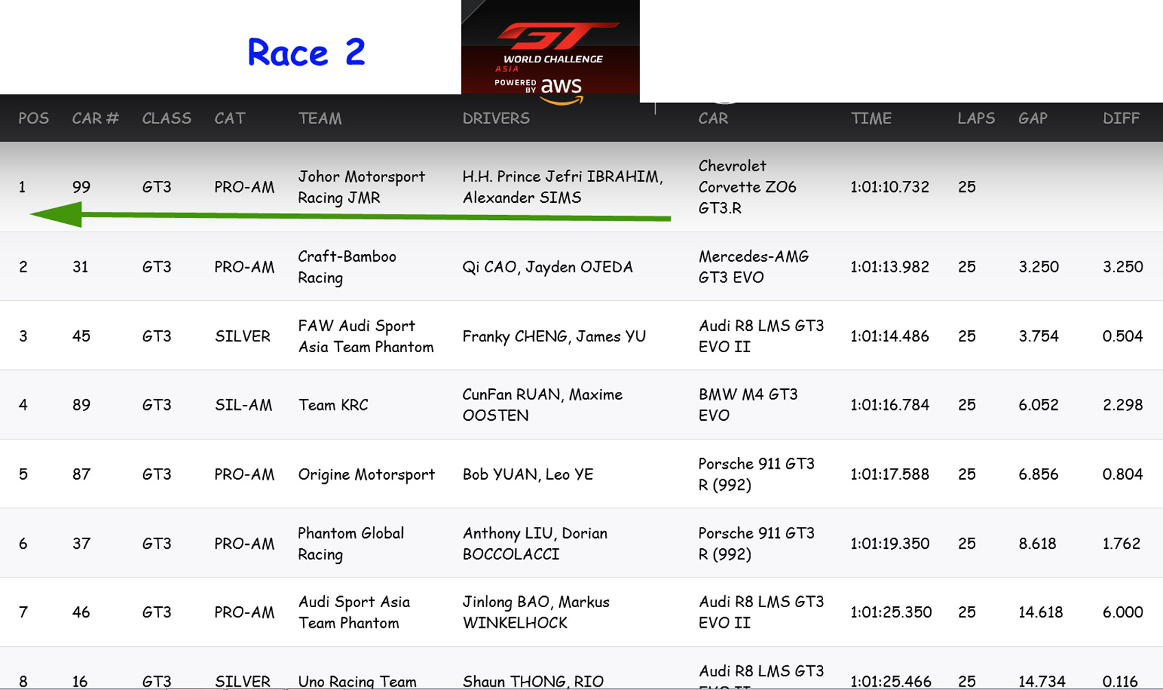 The Corvette also driven by Alexander Sims took the checkered flagin the Johor royal’s hands 3.2s ahead of Craft-Bamboo’s Cao Qi and Jayden Ojeda, while Franky Cheng and James Yu (FAW Audi Sport Asia Team Phantom) made up 12 places in the final 14 minutes to complete the overall podium and claim Silver spoils for the second time in as many races.