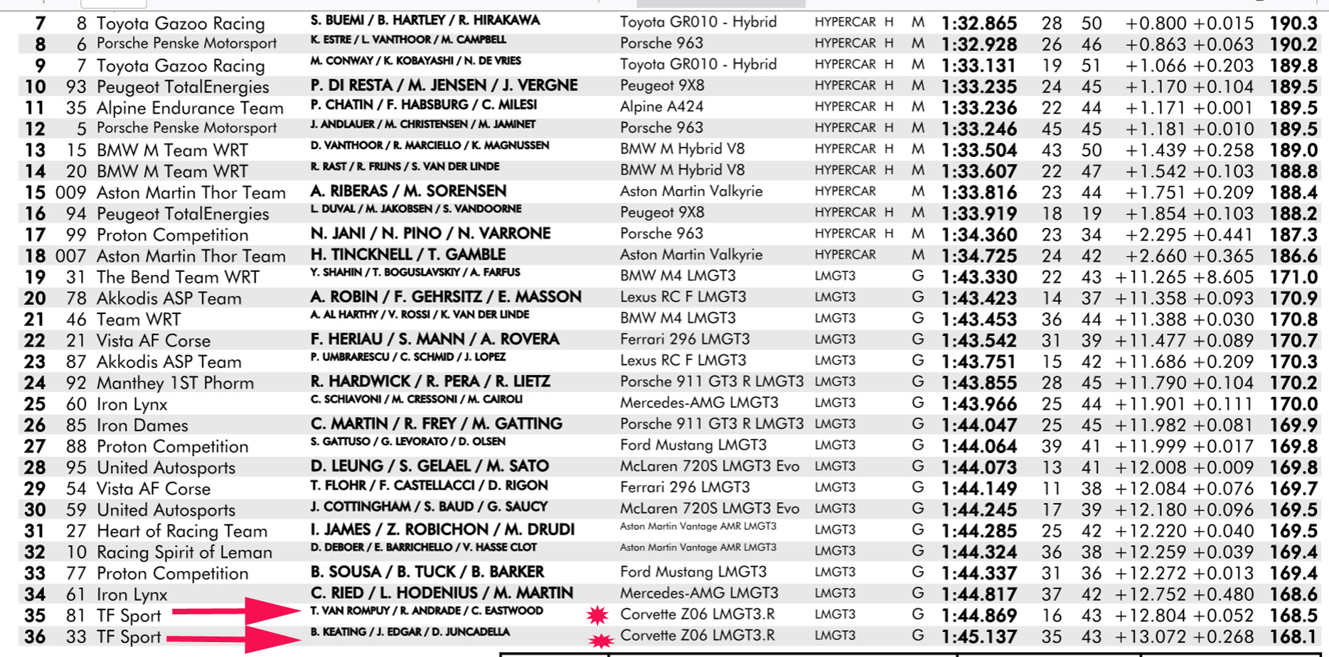 Last Place Down in 17th and 18th, TF Sport’s Corvettes were 1.5s and 1.8s off, with the Qatar winning No. 33 which is carrying the maximum amount of success ballast as a result of its Round 1 performance the slowest car.