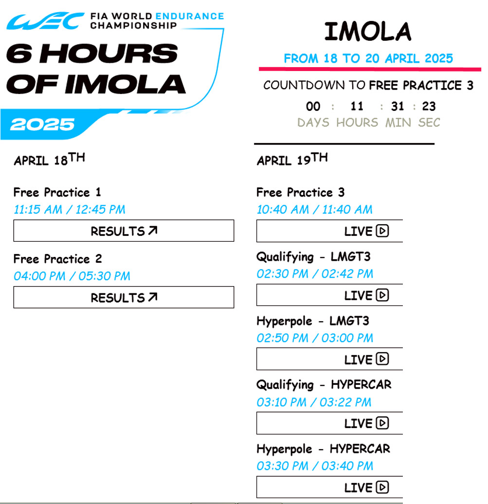 #6765 - 04/19/2508:14 AMRe: WEC Six Hours of Imola in Italy 4/20/25