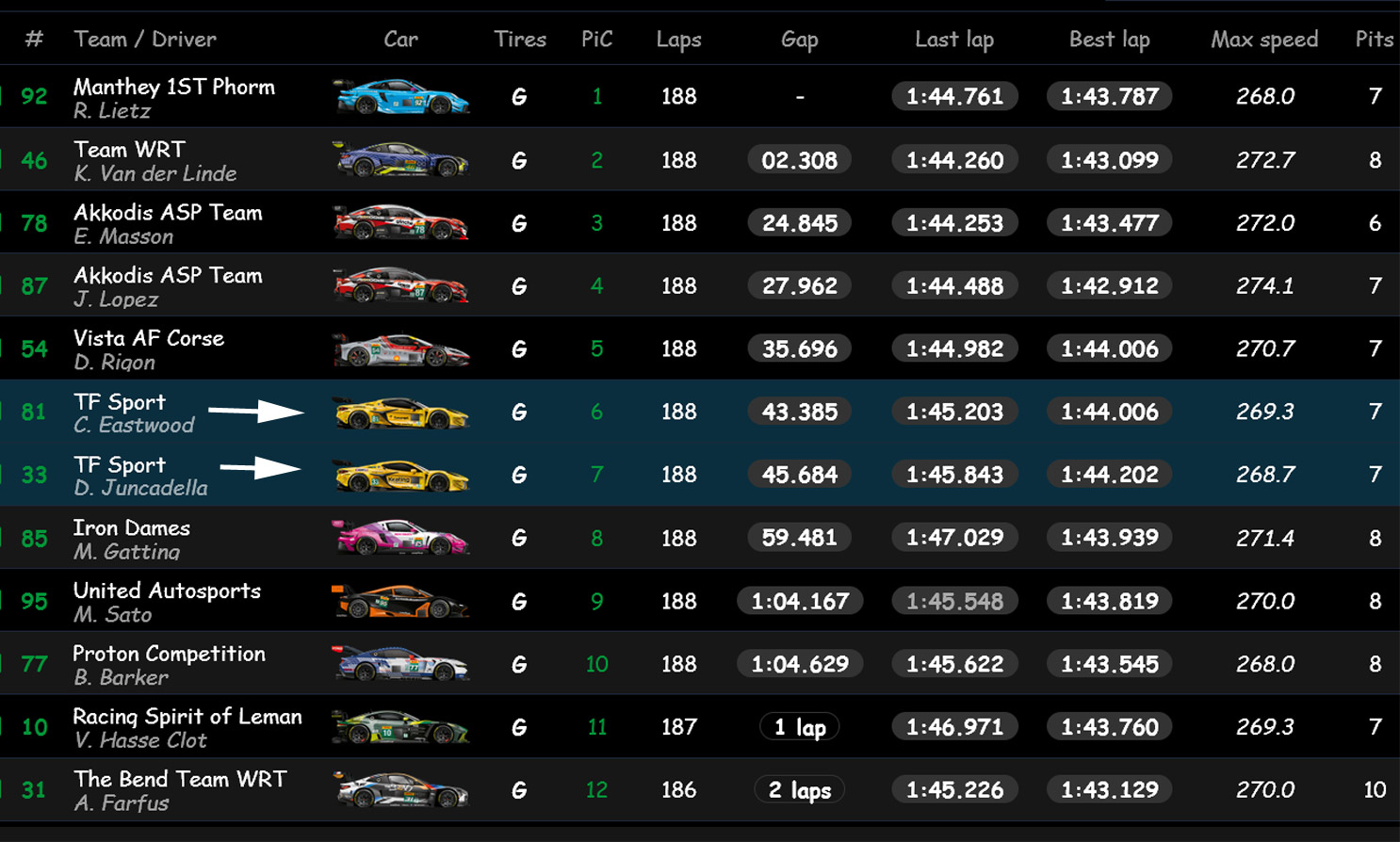 LMGT3 class honors went to the No. 92 Manthey Racing Porsche 911 GT3 R of Richard Lietz, Riccardo Pera and Ryan Hardwick, following a costly penalty for Rossi that likely denied the Italian and Team WRT victory.