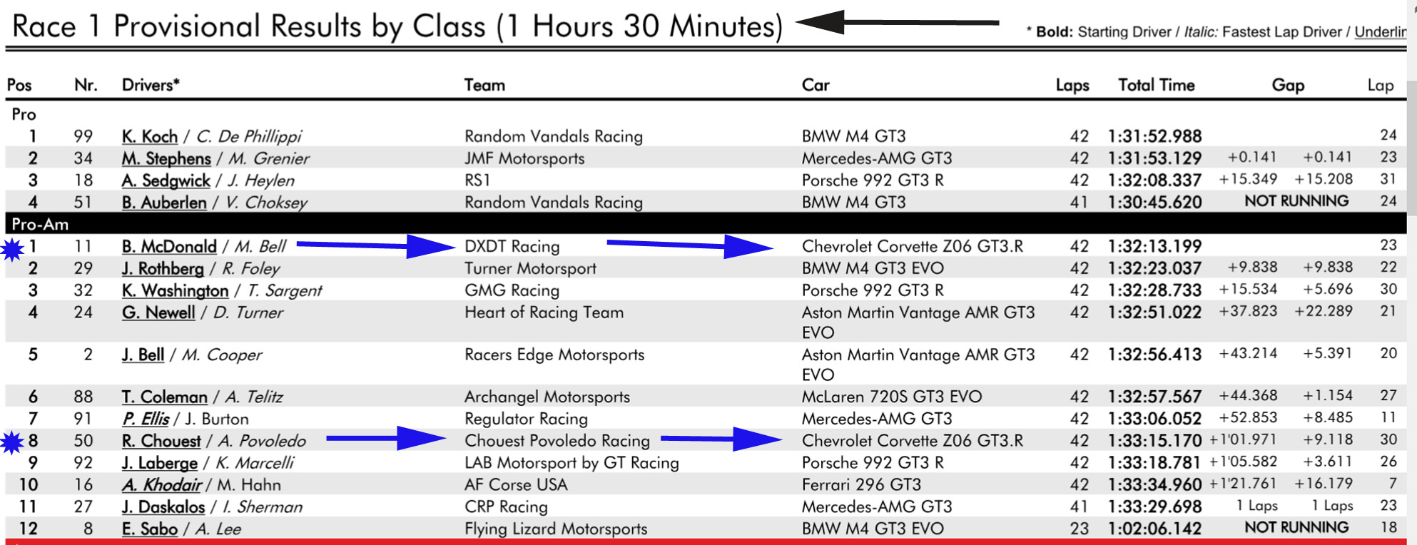 No. 11 DXDT Racing Chevrolet Corvette Z06 GT3.R – Blake McDonald No. 50 Chouest Povoledo Racing Chevrolet Corvette Z06 GT3.R – Ross Chouest No. 70 MISHUMOTORS Callaway Corvette Z06R GT3 – Mirco Schultis