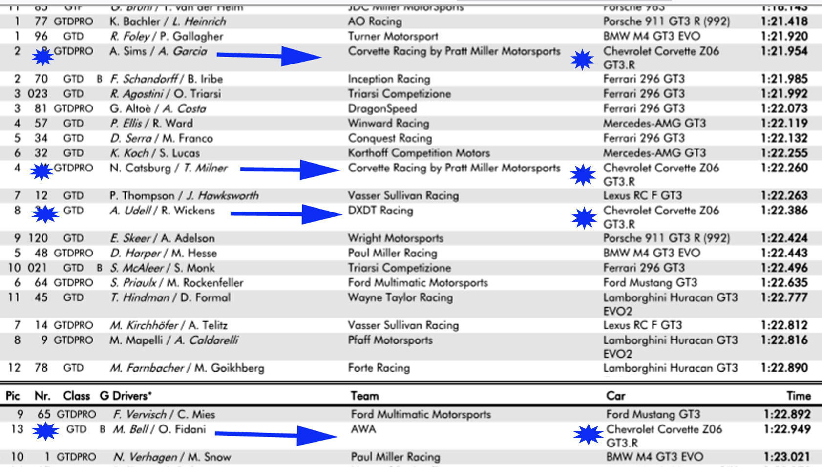 Corvette Racing by Pratt Miller Motorsports – GTD PRO: Antonio Garcia and Alexander Sims (No. 3 Corvette); Nicky Catsburg, Tommy Milner (No. 4 Corvette) AWA – GTD: Matt Bell, Orey Fidani (No. 13 Corvette) DXDT Racing – GTD: Alec Udell, Robert Wickens (No. 36 Corvette)