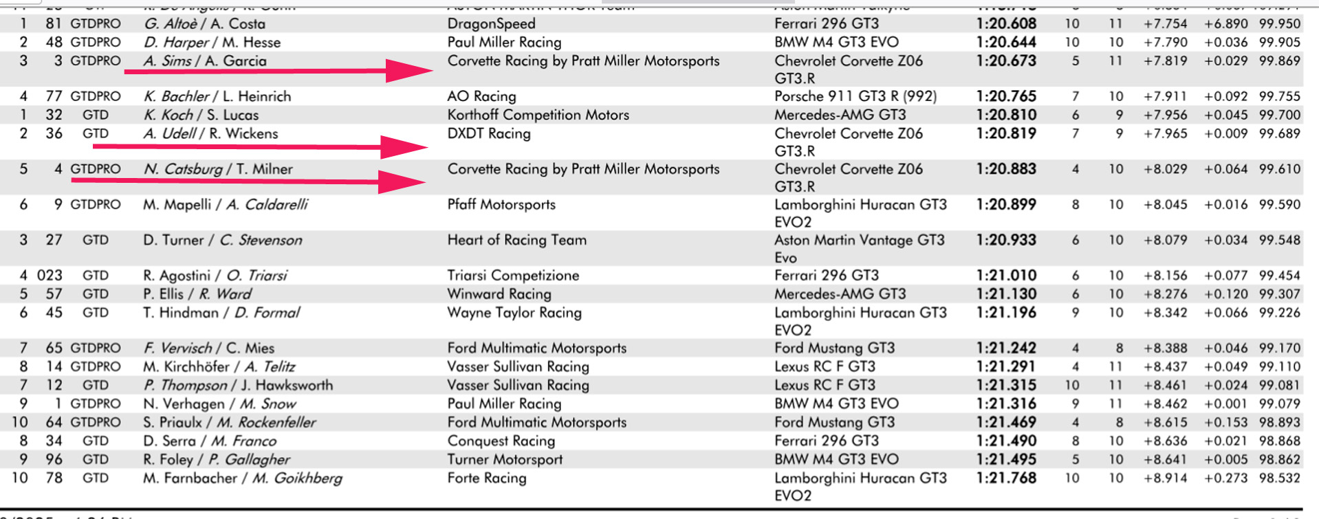 The Pratt Miller Motorsports factory Corvette Z06 GT3.Rs finished first and second in GTD PRO, led by the No. 4 of Nicky Catsburg with a 1m21.187s, a tenth and a half up on the No. 3 of Alexander Sims.