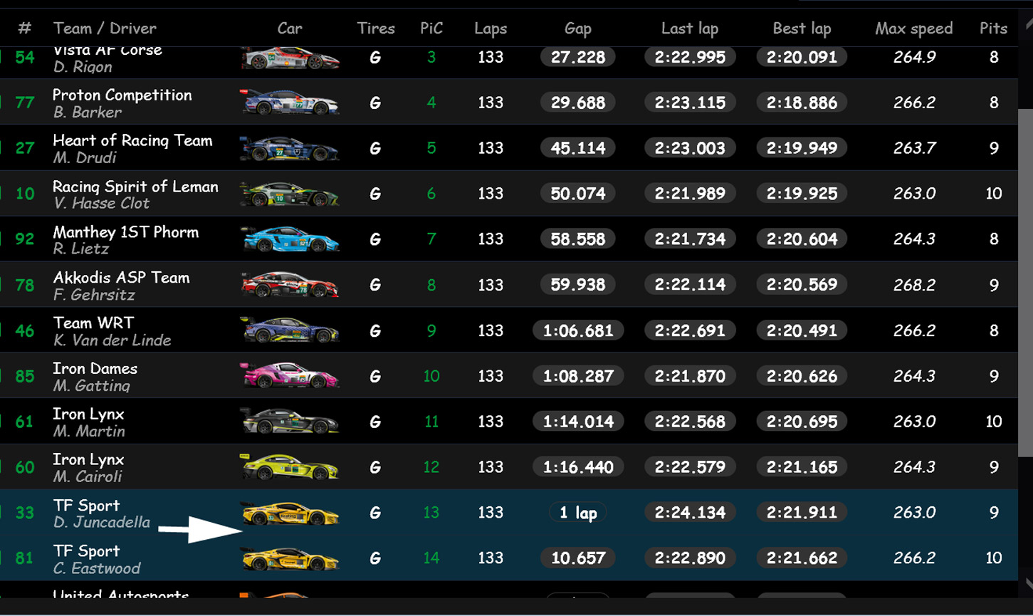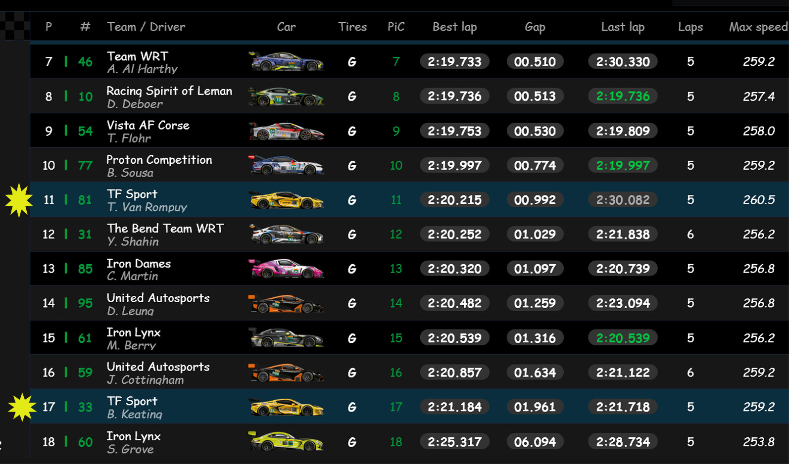 Both TF Sport Corvettes are at the back of the class in 11th and 17 places frown