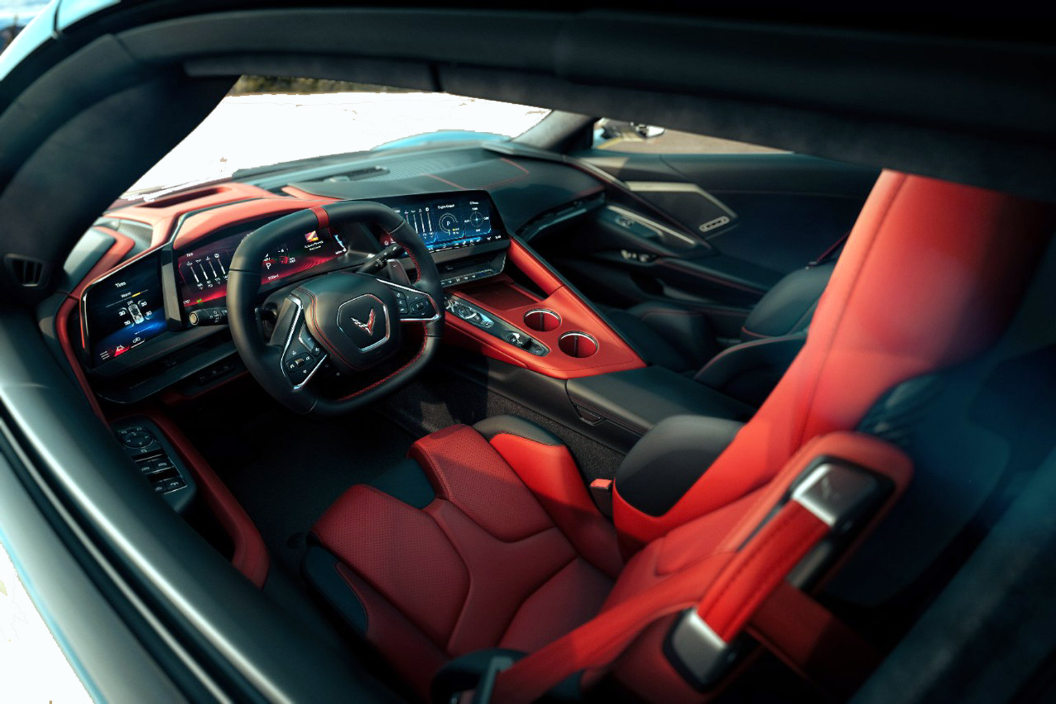 Corvette’s new interior focuses on ultimate craftsmanship, and provides customers with an elevated, modern appearance, offering bespoke customization options – including a Corvette-first asymmetrical interior colorway, available in Jet Black and Adrenaline Red.