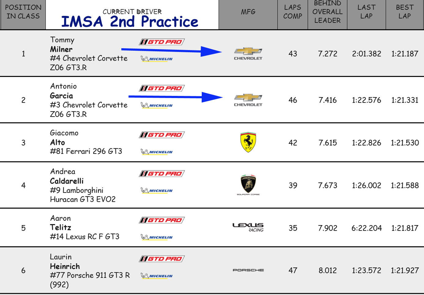 The Pratt Miller Motorsports factory Corvette Z06 GT3.Rs finished first and second in GTD PRO, led by the No. 4 of Nicky Catsburg with a 1m21.187s, a tenth and a half up on the No. 3 of Alexander Sims.