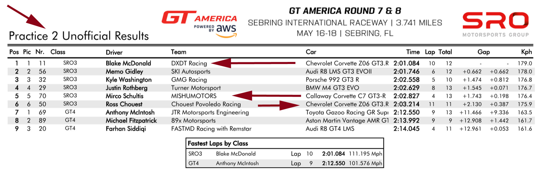 Blake McDonald set the pace in the second and final GT America powered by AWS practice session of the weekend at Sebring International Raceway.