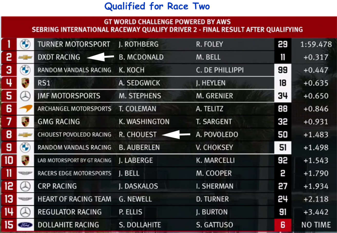 Foley, meanwhile, reeled off a qualifying-best lap of 1:59.478 to edge out the No. 11 DXDT Corvette of Matt Bell by 0.317 seconds, with Connor De Phillippi qualifying third overall and was quickest in Pro in the No. 99 Random Vandals BMW.