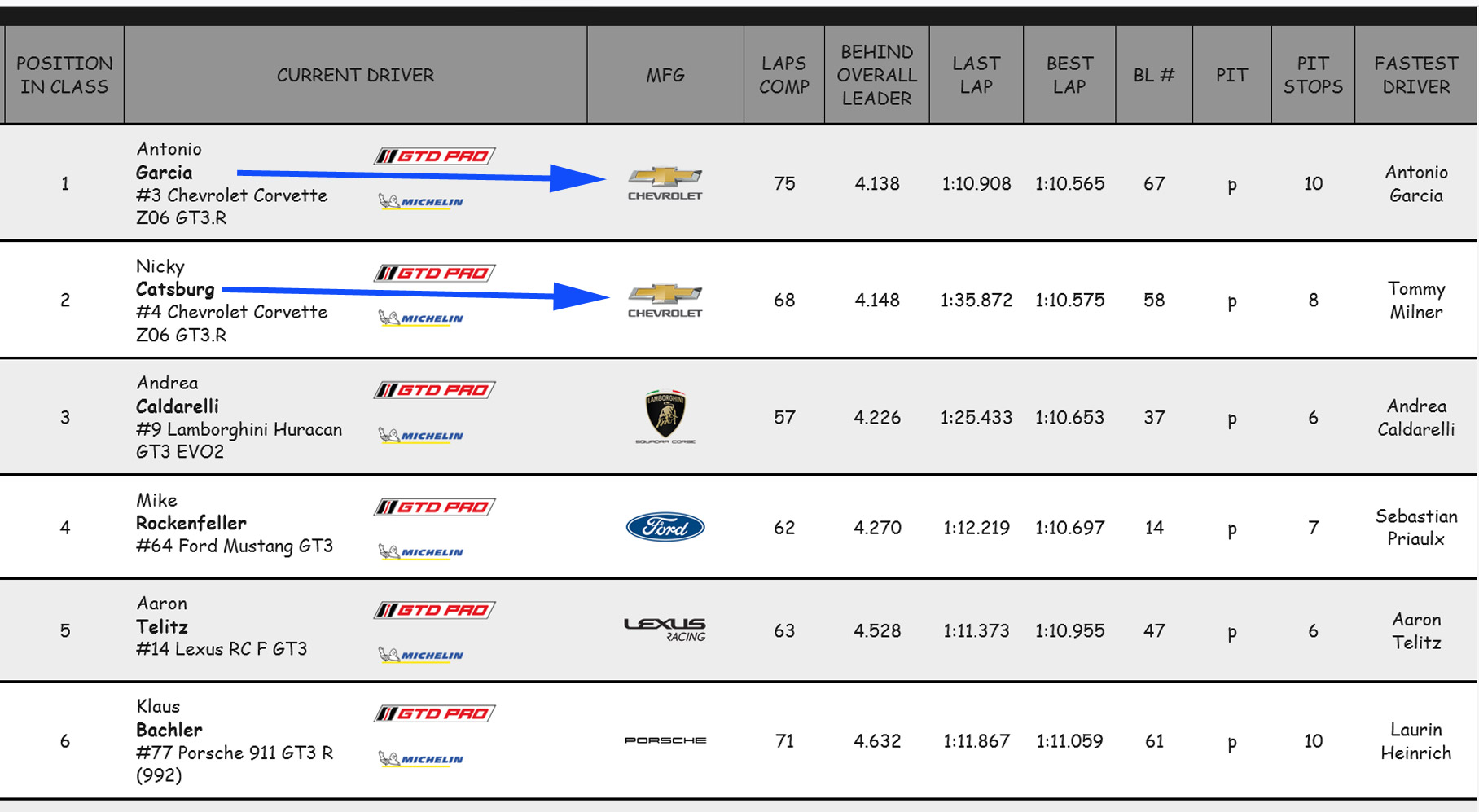 Telitz emerged from the pits in third and was handed another drive-through, this time for a pit lane infraction. Both Heinrich and the No. 4 Corvette of Nicky Catsburg received post-race incident responsibility penalties, equivalent to a drive-through, for incidents between both cars, which dropped them to fifth and sixth in the finishing order.