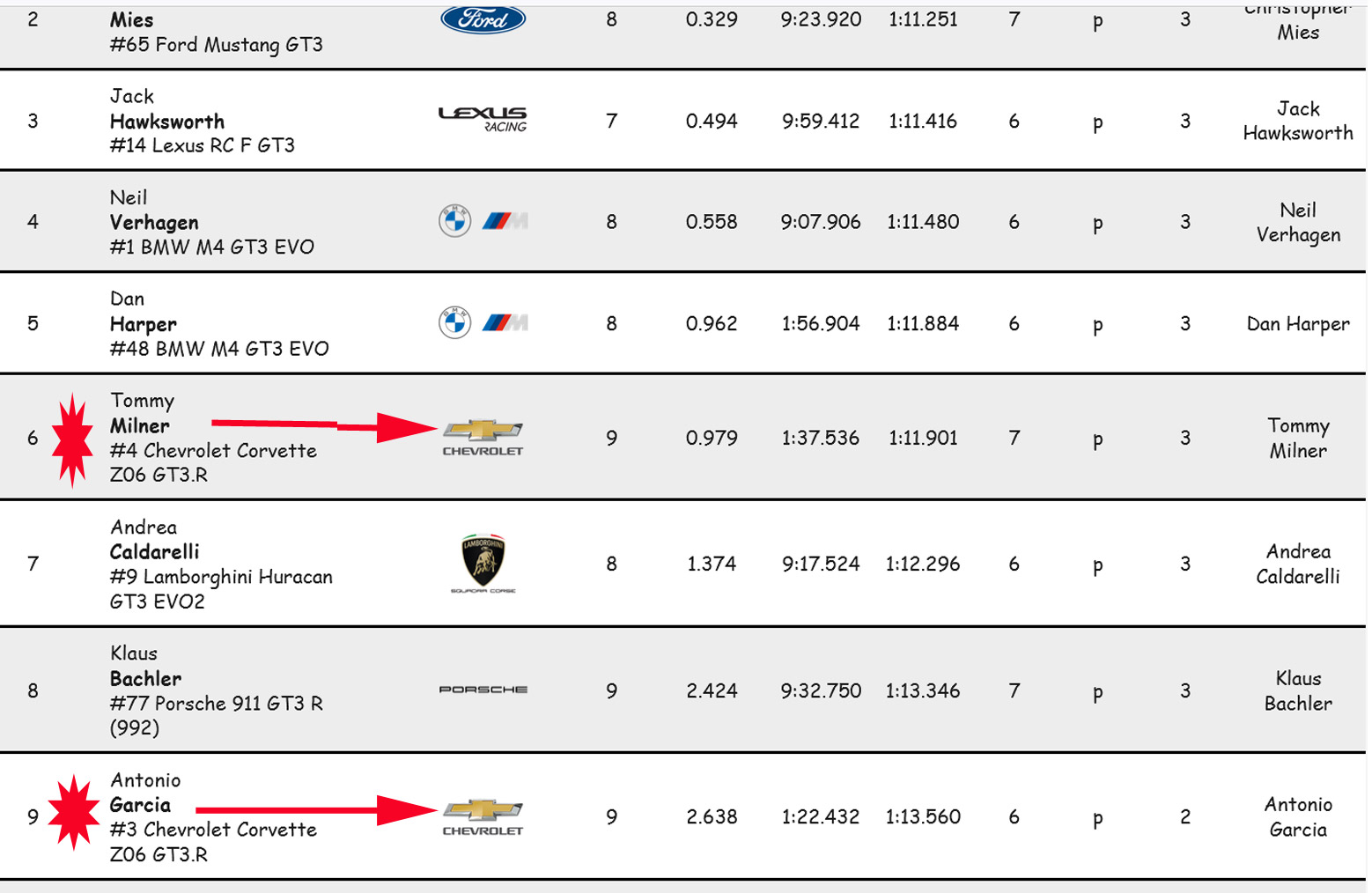 Tommy Milner was the fastest Corvette Z06 GT3.R driver in Friday’s 15-minute GTD PRO qualifying that saw a red-flag stoppage period nearly 10 minutes into the session. A line of six cars ran mostly nose-to-tail for the first green-flag portion, with Milner sixth in the No. 4 Corvette and teammate Antonio Garcia ninth in the No. 3, which lost its fastest qualifying time due to causing a red flag in Friday’s second practice.