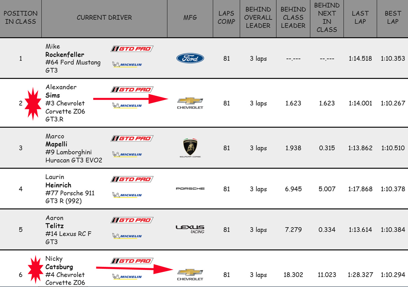 Garcia took the start in the No. 3 Corvette and moved up to fourth for the majority of his 30-minute stint. He stopped from the class lead, and the team lost only two spots after taking fuel and a mighty outlap for Sims. He moved up into second when the then-class leader had to make its second stop of the race and set out for the win. Sims set the fastest lap of the race a couple of lapse into his stint and got to within a half-second of the class-winning car before taking the checkered flag in second.