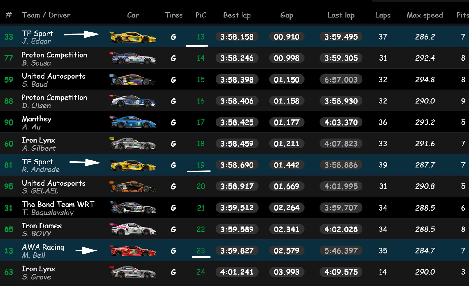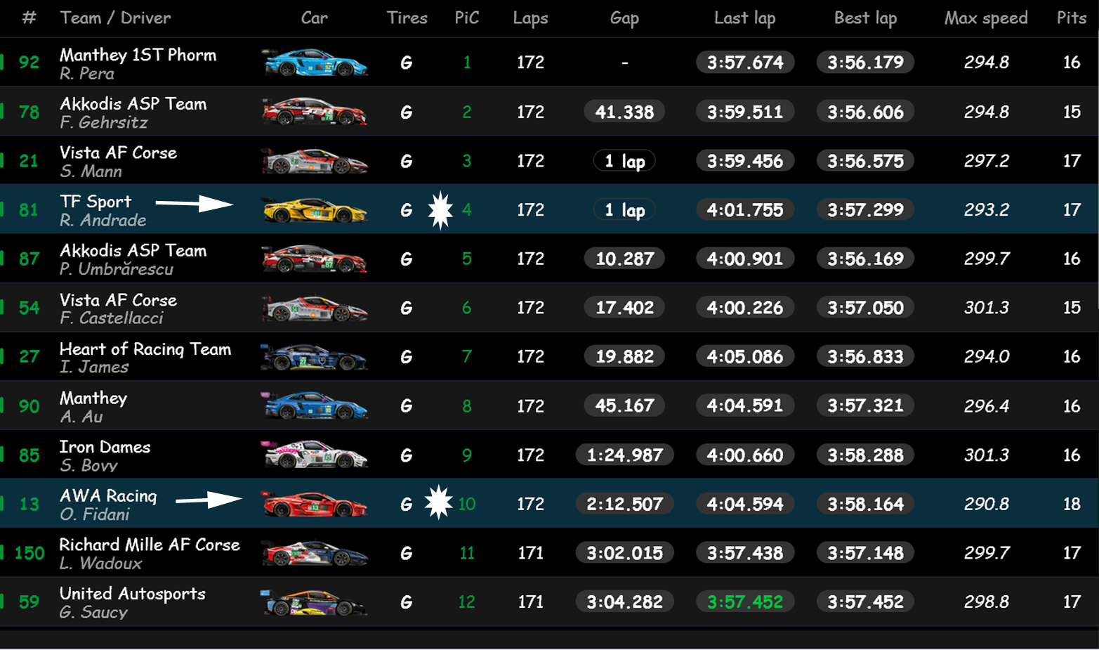 With 24 cars in LMGT3 here is how the other 2 Corvettes are doing at the 9 hours mark